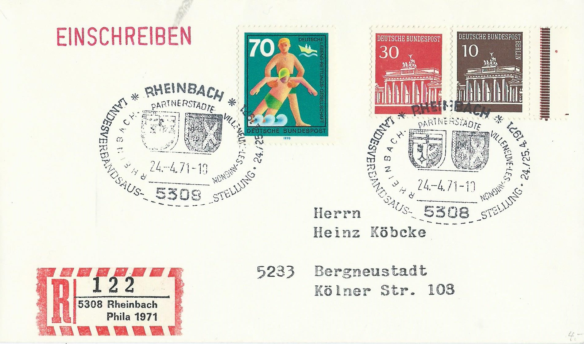 Der hier gezeigte erste Beleg, ein Einschreiben mit Sonderstempel von Rheinbach vom 24.4.71, hat unter anderem eine Marke Brandenburger Tor 10 Pf aus Berlin aufzuweisen. Diese stammt aus dem Heftchenbogen, erkennbar an der senkrechten Strichelleiste. Dazu sind auf dem Randstück aber noch ein roter Nadelpunkt und ein kleiner brauner Anlagestrich zu sehen. Diesen Beleg konnte ich seinerzeit nicht in der Grabbelkiste liegen lassen und er kam für ganze 40 Cent zu mir ins Album.