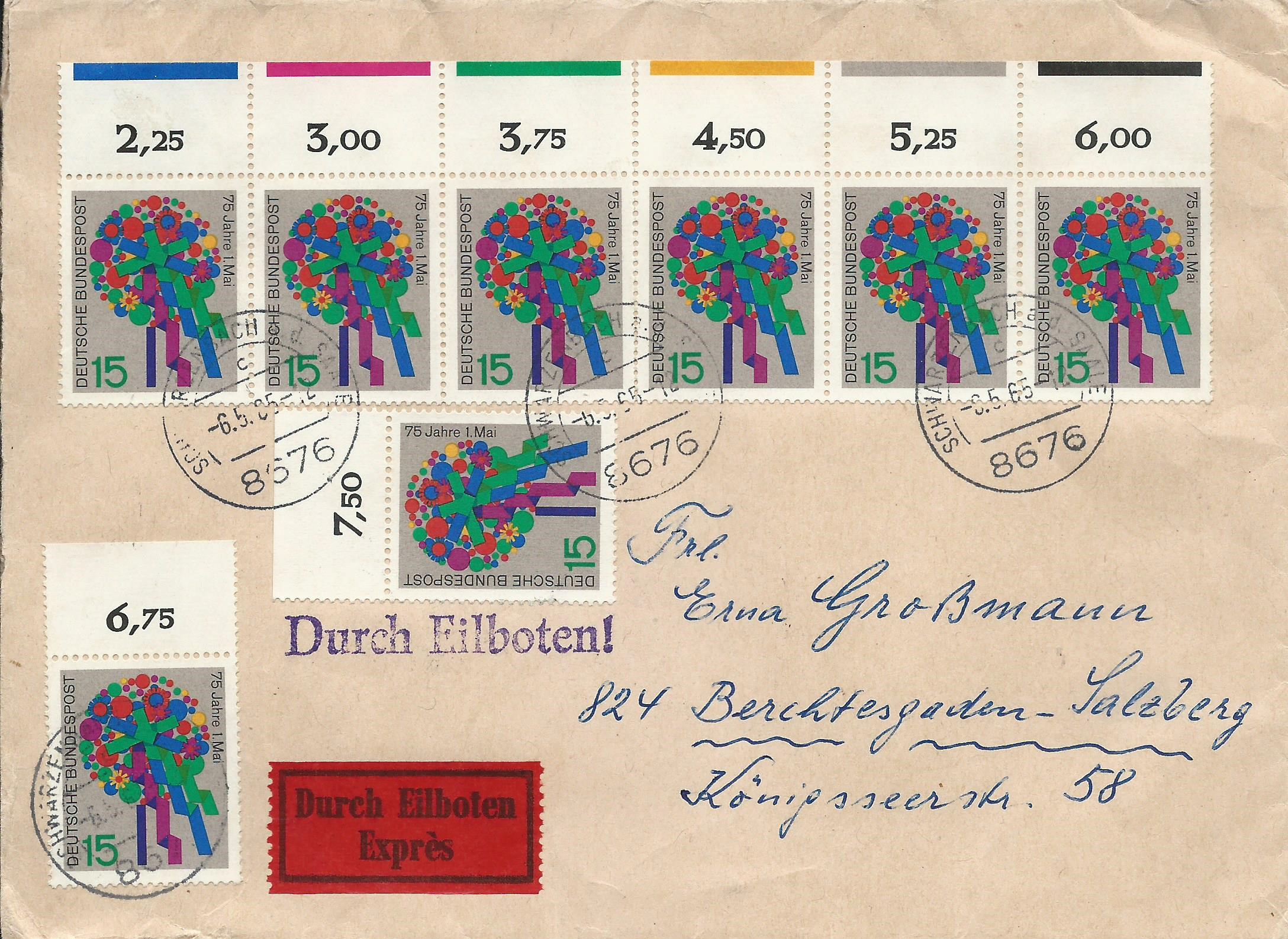 dank dem Hinweis eines Sammlerfreundes habe ich diesen Beleg günstigst ersteigern können. Hier haben wir die Bund-Mi.-Nr. 475 75 Jahre Tag der Arbeit vom Oberrand auf einem Eilbrief. Der zusammenhängende Teil ist das komplette Farbspektrum vom Farbrandstreifen, hier sind alle Druckfarben des Markenbildes zur Druckkontrolle abgedruckt. Gestempelt wurde in Schwarzenbach am 6.5.65. Solche kompletten Einheiten mit Farbrändern sind sehr gesucht, noch dazu auf Beleg!