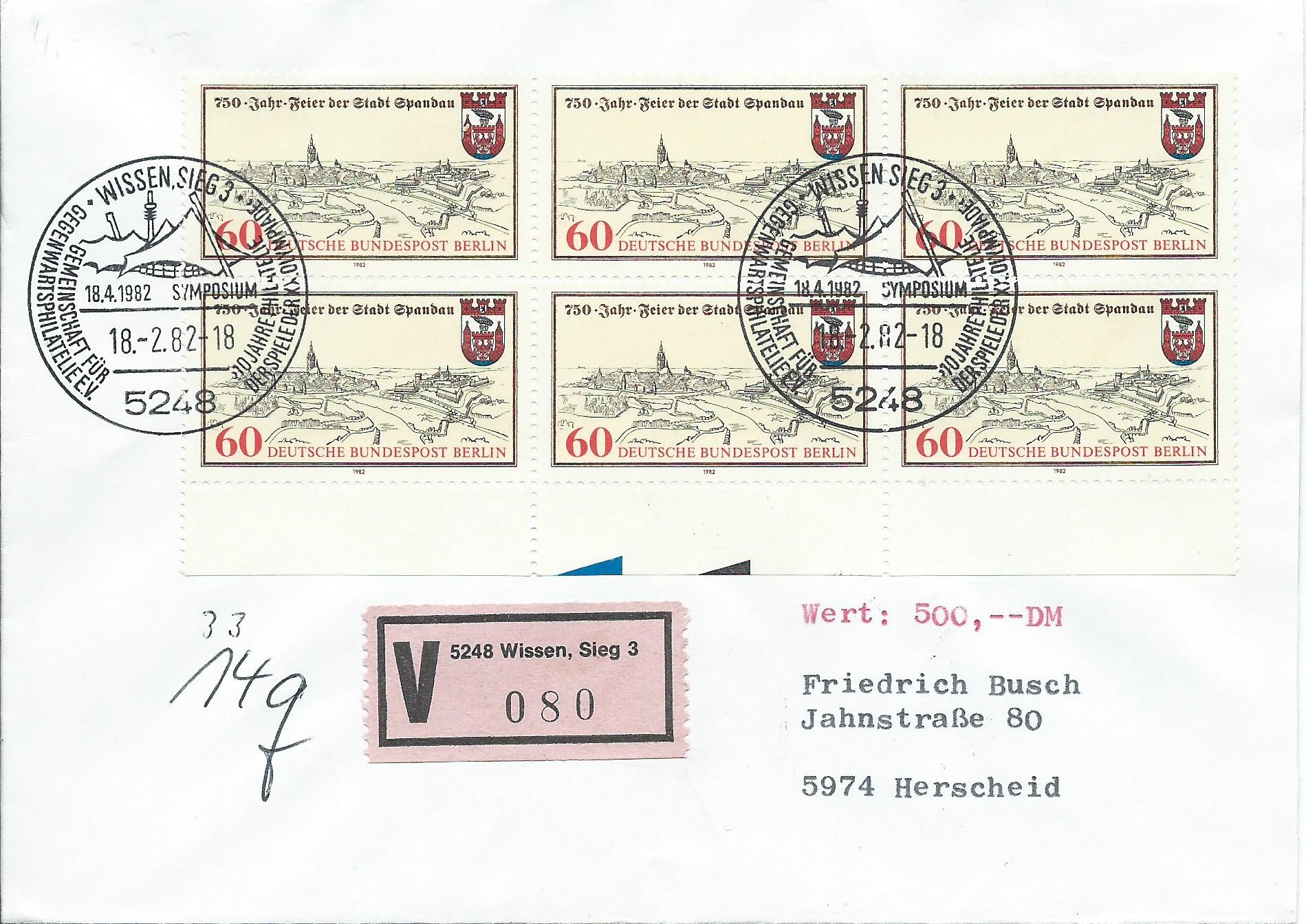 Als Beifang zum vorherigen Stück kam das nun folgende hinzu: Berlin Mi.-Nr. 659 750 Jahre Stadt Spandau als 6-er-Block vom Bogenunterrand auf einem Wertbrief. Gestempelt wurde der Beleg mit dem Sonderstempel von Wissen, Sieg 3 vom 18.2.82. Das Besondere hieran sind die beiden Farbkeile im mittleren Unterrand. Solche Belege nimmt man immer gerne für kleinstes Geld mit.