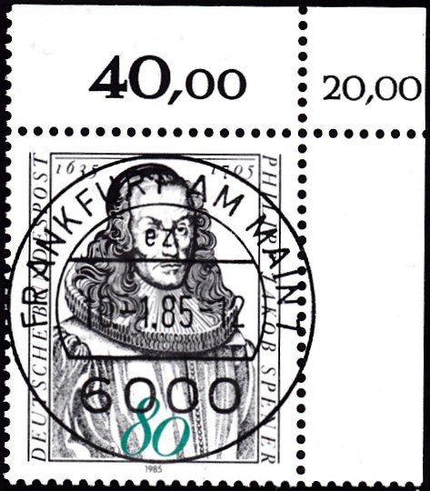 Auch dieses Eckrandstück der Marke zum 350. Geburtstag von Philipp Jakob Spener hat einen korrigierten Bogenwertzähler.