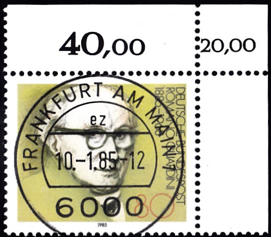 Eckrandstück der Marke zum 100. Geburtstag von Romano Guardini mit korrigierten Bogenwertzähler.