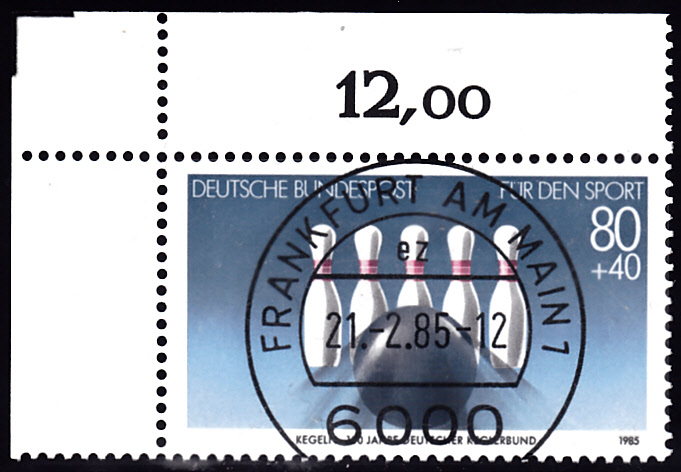 Bei diesem Eckrandstück der Sporthilfemarke "100 Jahre Deutscher Keglerbund" vom linken oberen Bogenrand sehen wir einen Schneidewinkel.