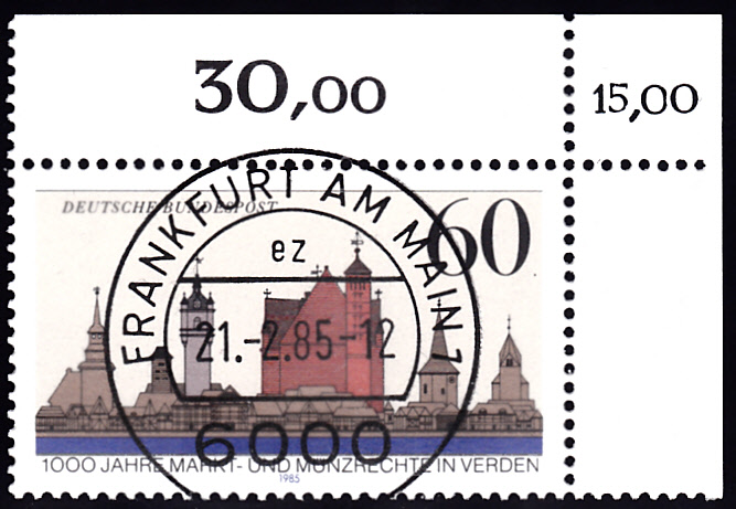 Eckrandstück der Marke zum Jubiläum "1000 Jahre Markt- und Münzrechte in Verden" mit korrigierten Bogenwertzähler.