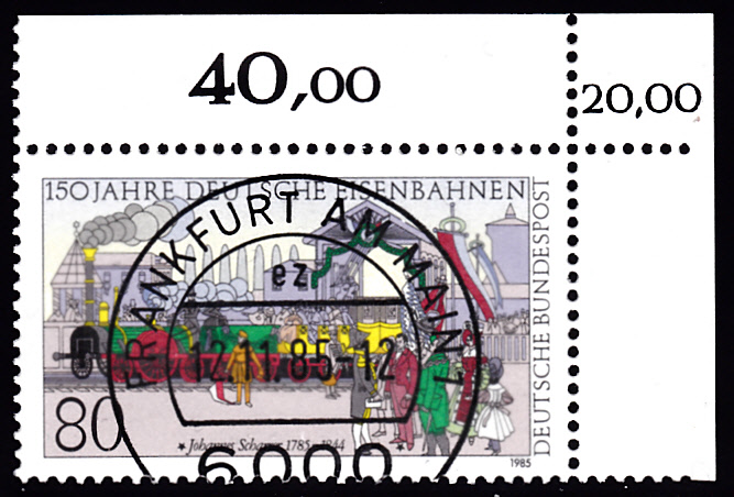 Eckrandstück der Marke zum Jubiläum "150 Jahre deutsche Eisenbahnen" und zum 200. Geburtstag von Johannes Scharrer (1785-1844, Mitbegründer) mit korrigierten Bogenwertzähler.