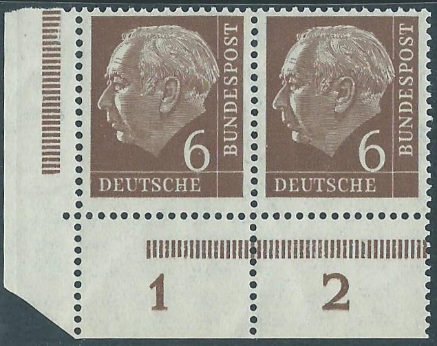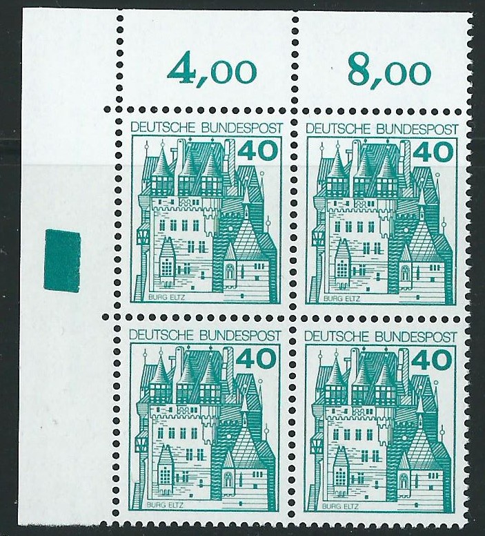 Kleine Ergänzung zu dieser Aufstellung auf Seite 3 Beitrag vom Di 4. Jun 2013, 21:32: Der Wert zu 40 Pf mit einem schönen senkrechten Rechteck als linker Eckrand-4-er-Block: