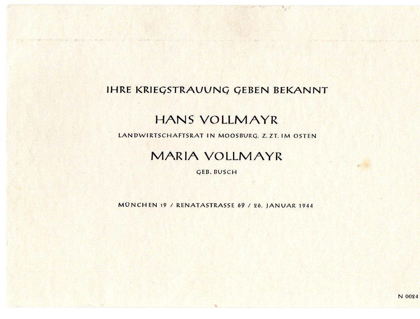 Aus der Kombination mit der Heiratsanzeige werde ich noch nicht schlau, besonders da alle drei Dokumente die Nummer 0024 zeigen, was in meinen Augen kaum Zufall sein kann. Hier die Heiratsanzeige: