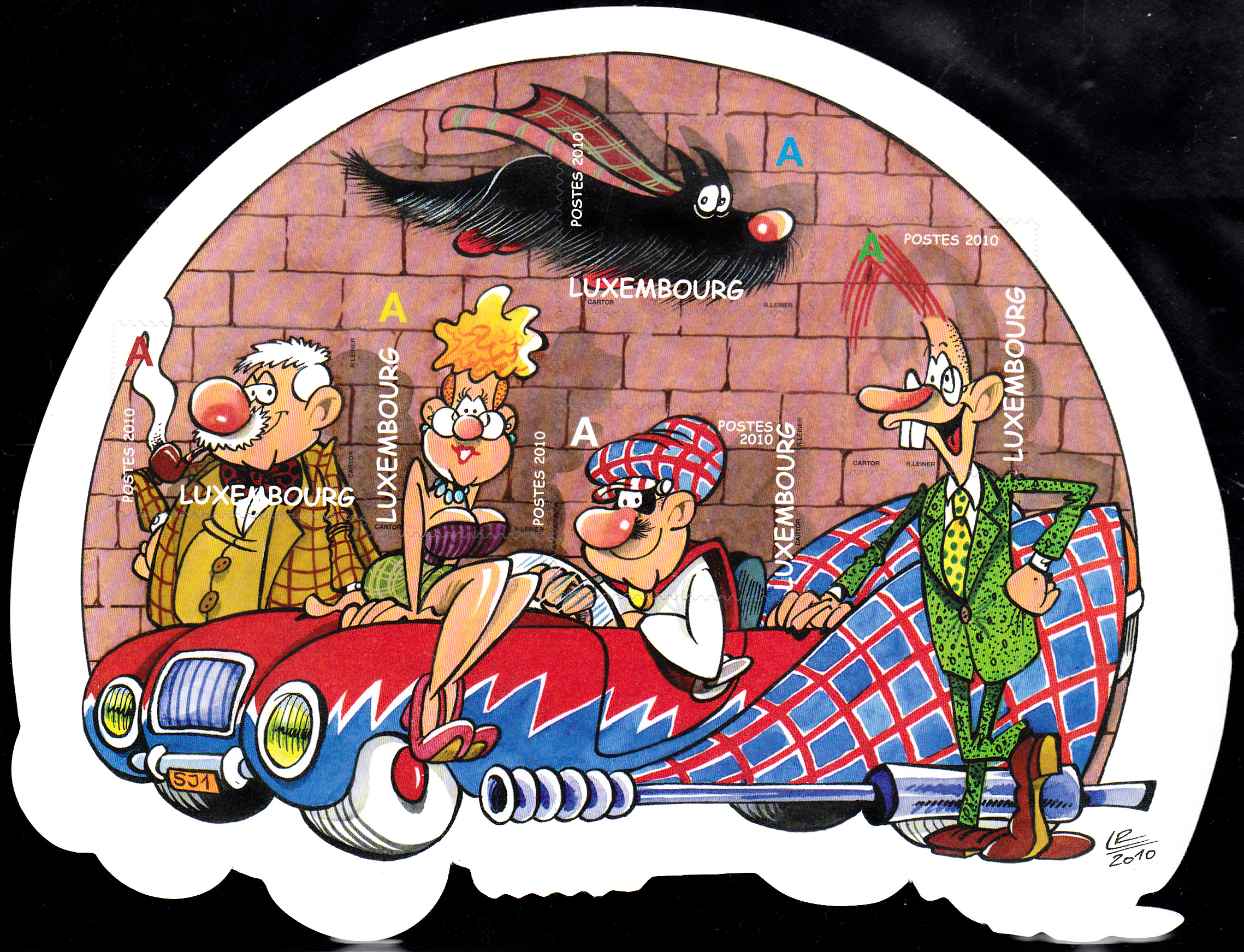Diese selbstklebende Blockausgabe ist 2010 in Luxemburg mit Figuren der Comicserie „Superjhemp“ von Lucien Czuga (*1954, Autor) und Roger Leiner (*1955, Zeichner) erschienen. Da der Block ausgestanzt wurde, konnte er auch einfach in diesem mehr oder weniger halbkreisförmigen Format hergestellt werden.