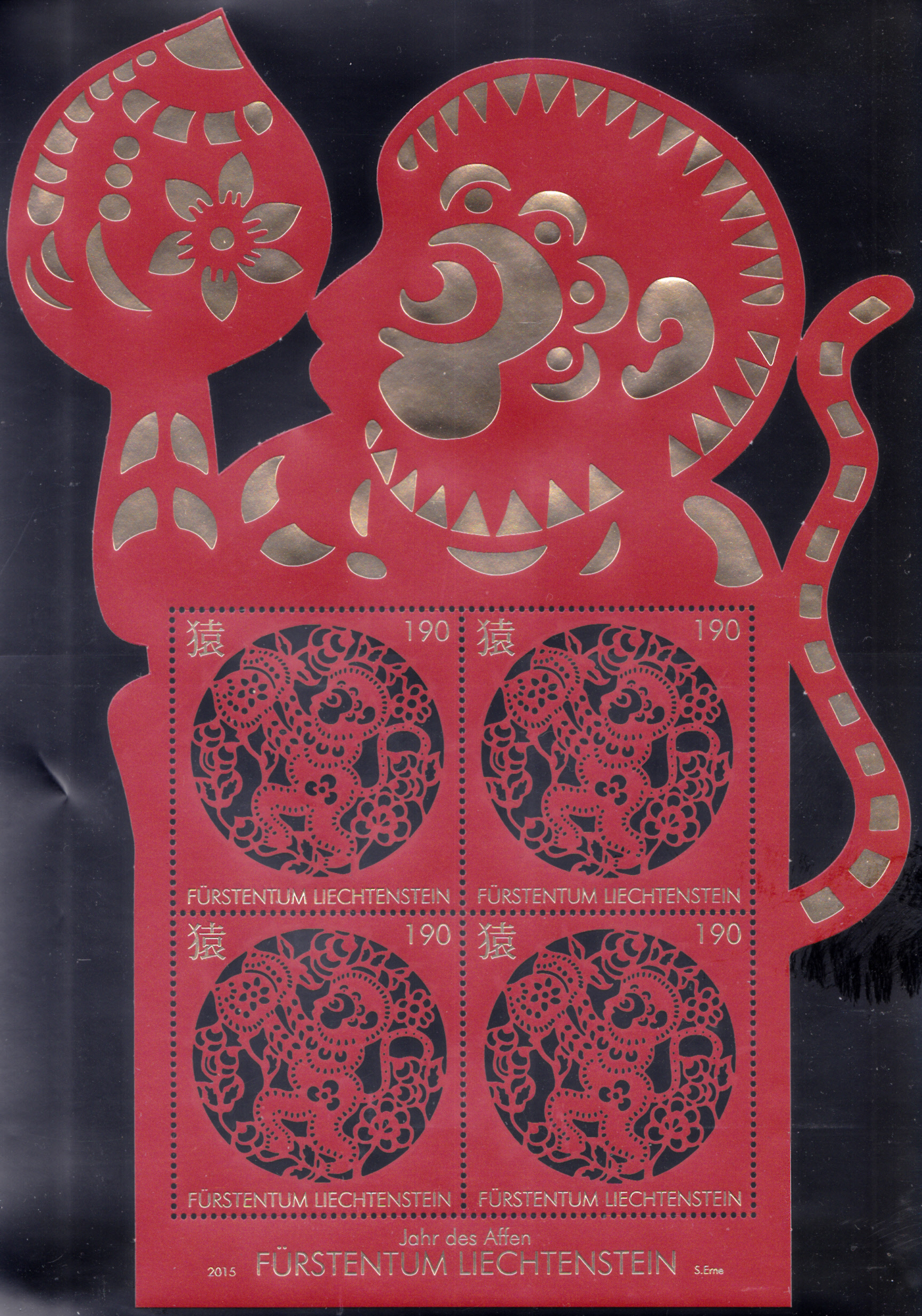 Hier ein Bogen in einem ungewöhnlichen Format: Der Bogen enthält vier Marken aus Liechtenstein (MiNr 1789) zum Chinesisches Neujahr, dem Jahr des Affen. Der Bogen ist in Form eines Affen ausgestanzt. Aber auch jede Marke hat, obwohl quadratisch, auch etwas ungewöhnliches: Die auf dem Scan schwarz erscheinende Markenteile sind nicht schwarz bedruckt, sondern Ausstanzungen im Markenbild.