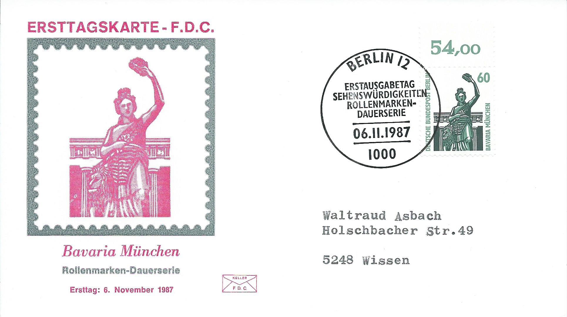 Der 60 Pf-Wert vom Bogenoberrand mit Reihenwertzähler 12,00 auf Ersttagsbrief mit dem Ersttagstempel Berlin vom 6.11.87: