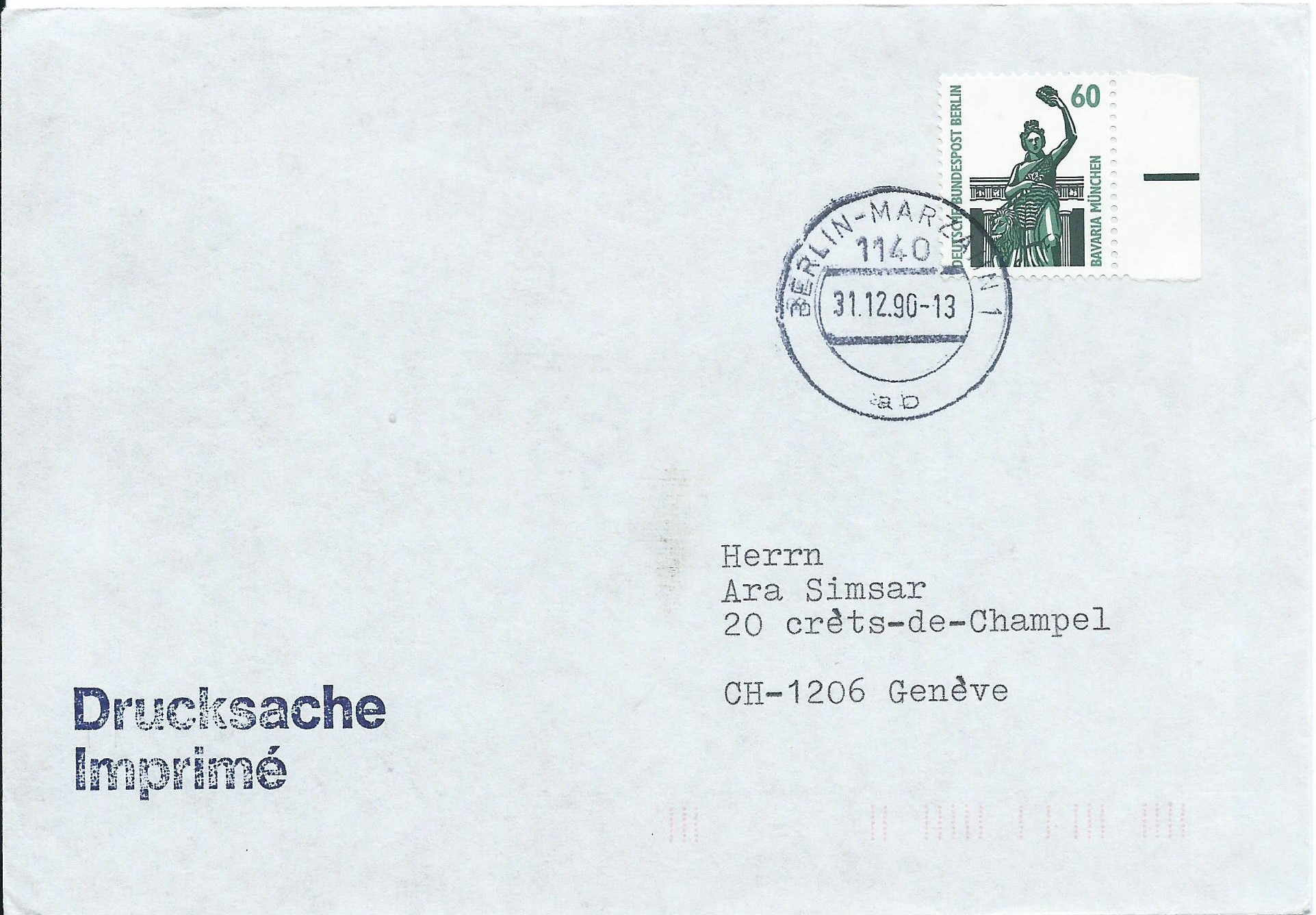 solch einen Beleg sieht man auch nicht alle Tage: Ein Wert zu 60 Pf vom rechten Bogenrand von Berlin-Marzahn (also Ost-Berlin) in die Schweiz als Drucksache gelaufen. Gestempelt wurde der Beleg in Berlin-Marzahn am 31.12.90 mit einem „alten“ DDR-Stempel.