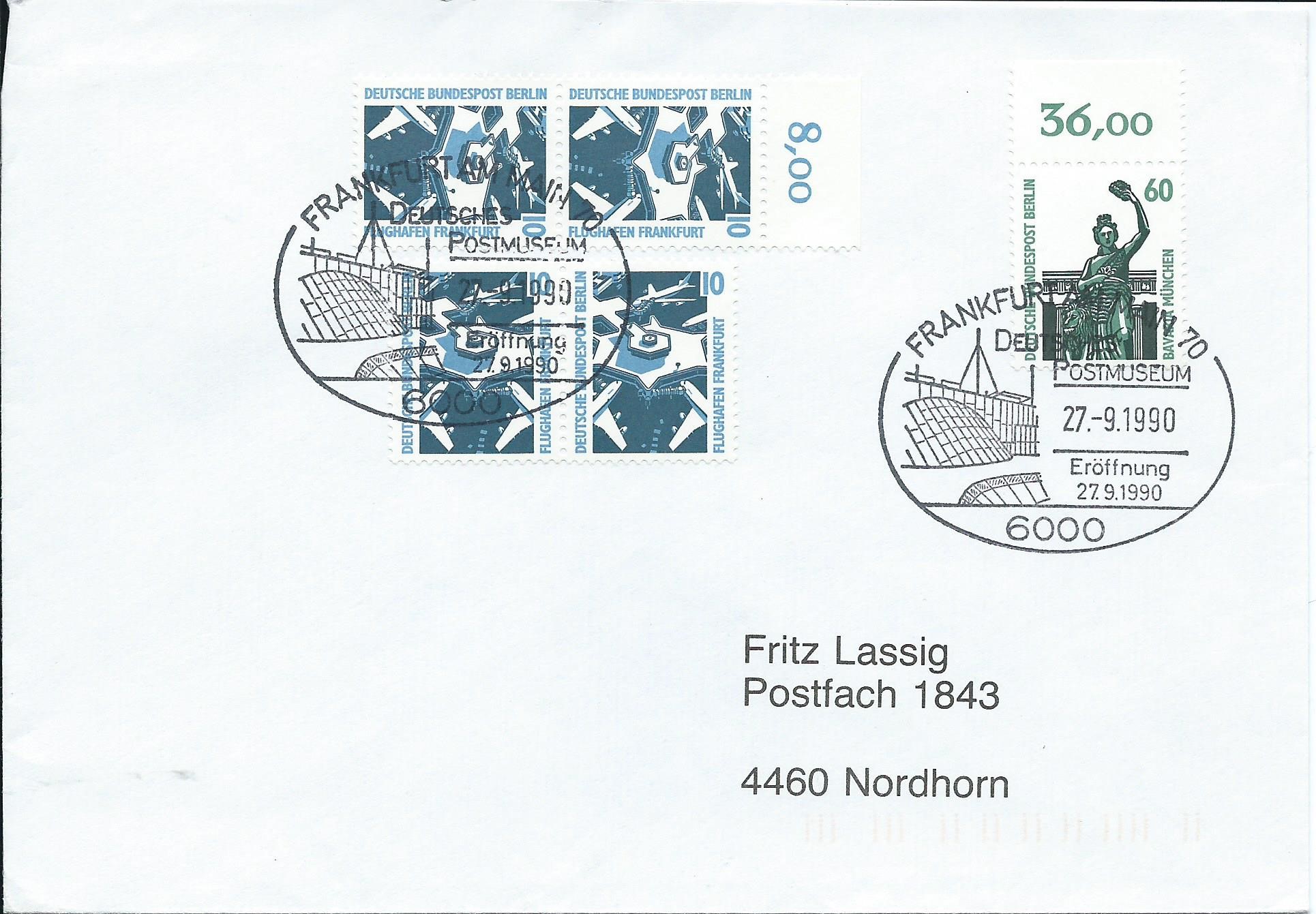 hier kommt ein Beleg, der gleich in 2 Wertstufen passt: Einmal zur 10 Pf und einmal zur 60 Pf-Marke. Von der 10 Pf-Marke sind ein waagrechtes und ein senkrechtes Paar verklebt worden, letzteres vom Bogenoberrand mit Reihenwertzähler 8,00 sowie ein Oberrandstück 60 Pf mit Reihenwertzähler 36,00. Gestempelt wurde der Beleg mit einem Sonderstempel von Frankfurt am Main am 27.9.90.