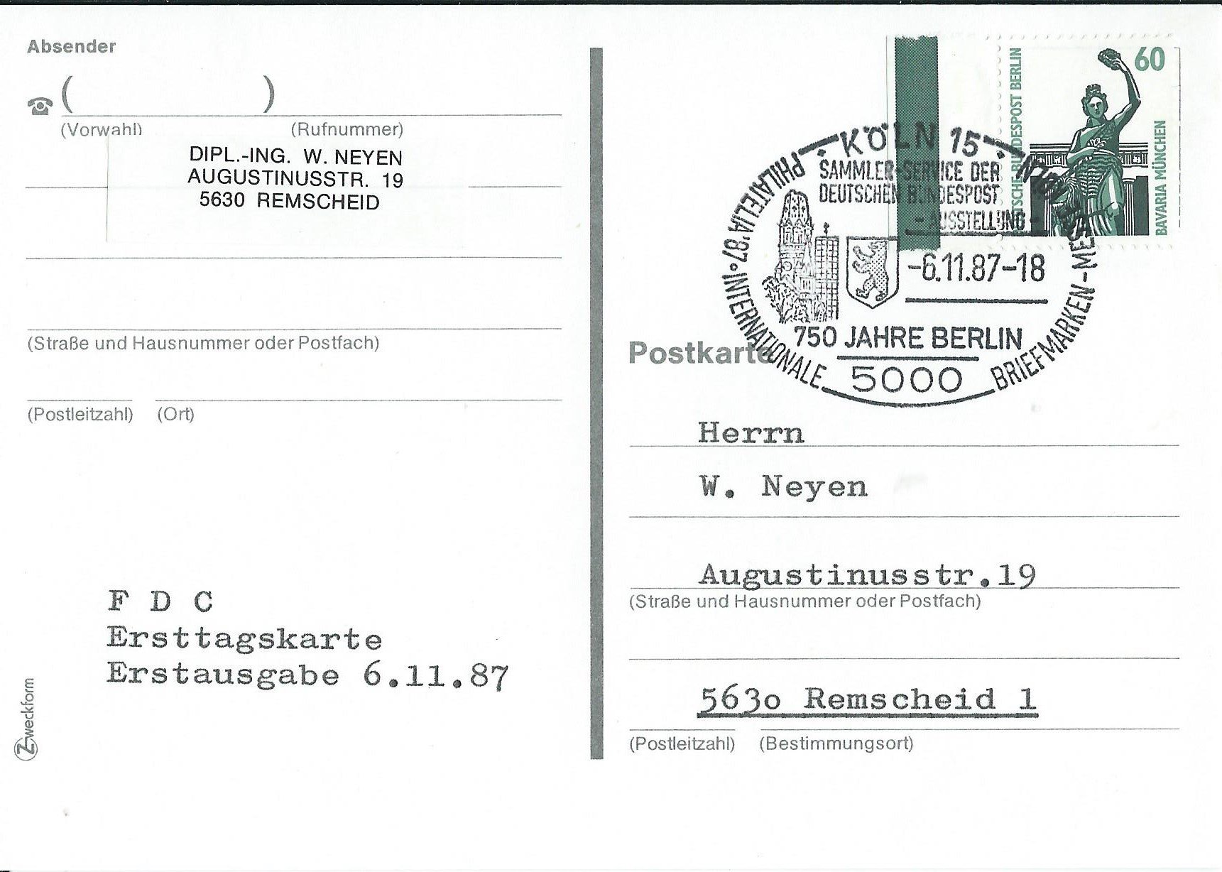 der Wert zu 60 Pf vom linken Seitenrand auf einer Ersttagspostkarte. Gestempelt wurde mit einem Kölner Sonderstempel vom 6.11.87: