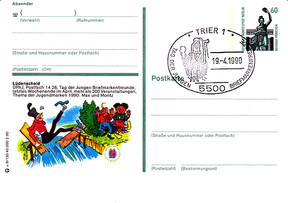 Bildpostkarte aus der Serie 1990 mit Wertstempeleindruck der 60 Pfennig Marke SWK. Auftraggeber dieser Ausgabe war die Deutsche Philatelisten Jugend e.V. Ausgabeanlass war der "Tag der Jungen Briefmarkenfreunde" 1990 der unter zum Thema der Jugendmarken "Max und Moritz" Ende April bundesweit durchgeführt worden ist. Die Auflage betru 40 000 Stück. Die hier gezeigte Karte ist mit einem Sonderstempel vom 19.4.1990 zum TdJB der beim Postamt Trier 1 geführt wurde