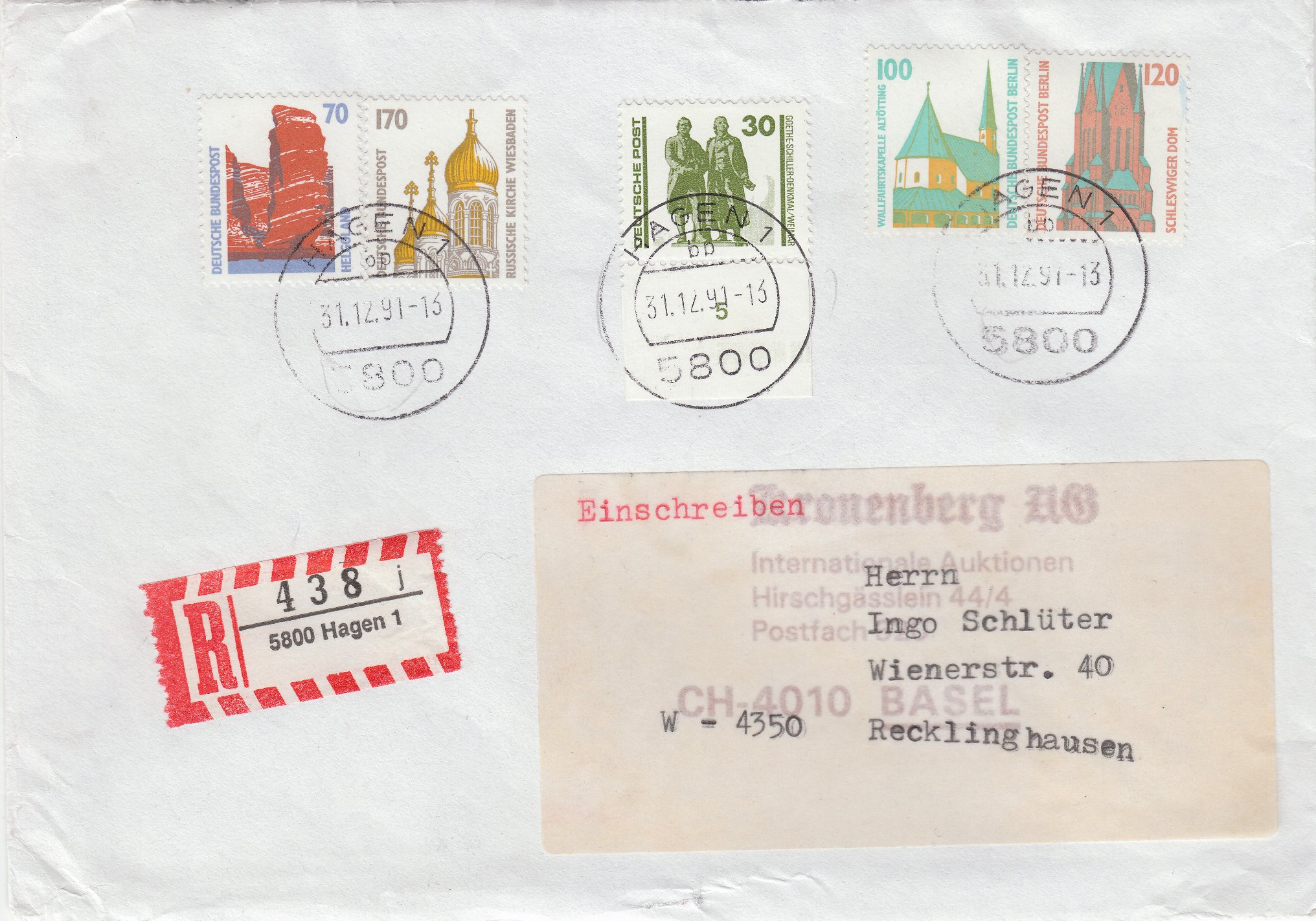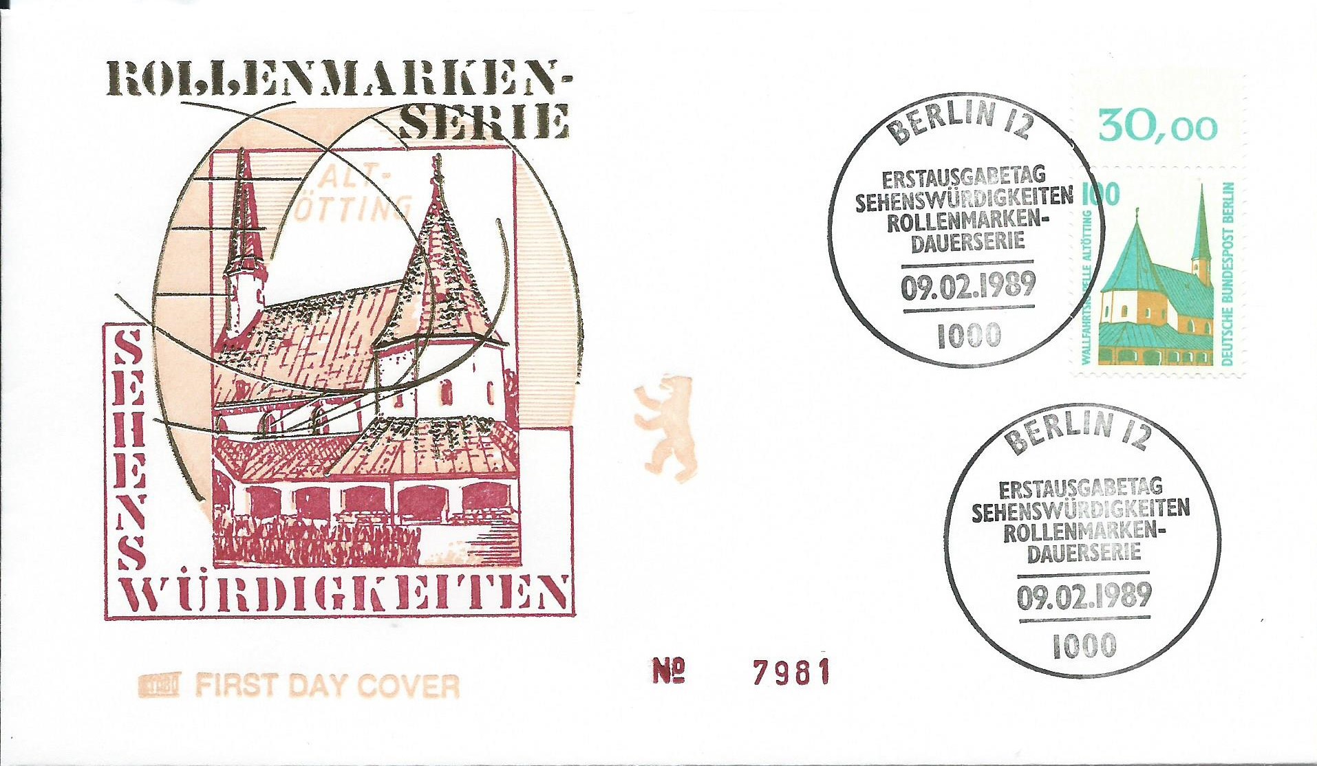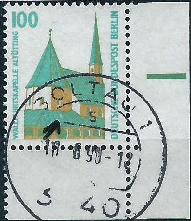 Mir ist es gelungen, von der Sehenswürdigkeiten 100 Pf Berlin eine Ganzfälschung zu erhalten. Ein Sammlerfreund hatte noch ein kleines Bogenteil übrig und mir vermacht. Im grossen Bild habe ich einmal eine echte Marke vom Eckrand zum Vergleich mit gezeigt. Da sieht man wunderbar die Unterschiede alleine schon in der Papierfarbe. Die Fälschung hat gelbliches Papier, das Original hell weisses. Und das Druckbild der Fälschung ist auch nicht so klar wie das Original. Seht selbst: