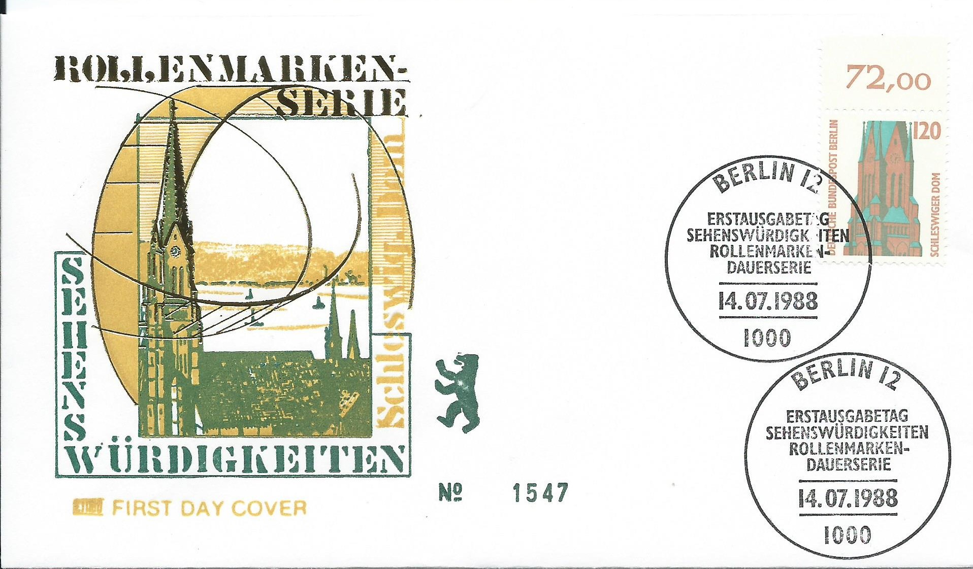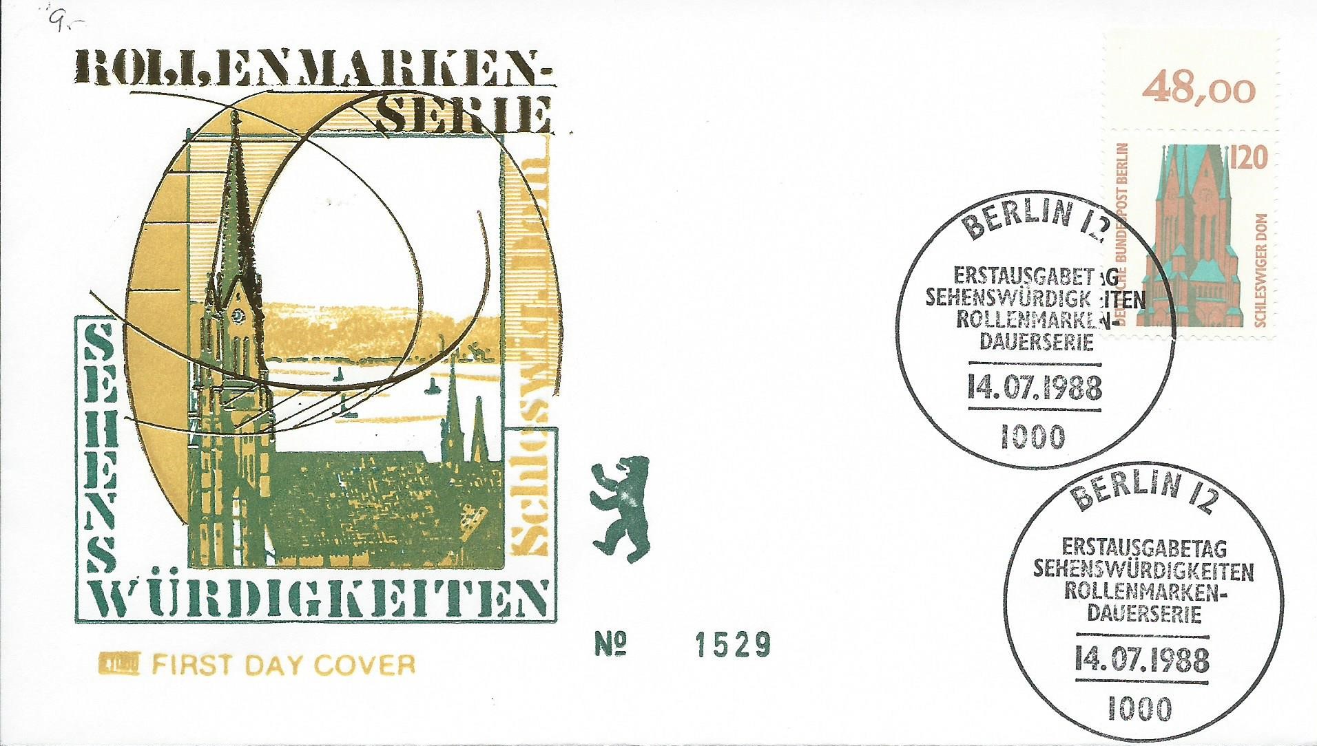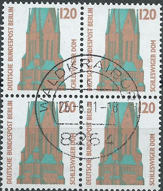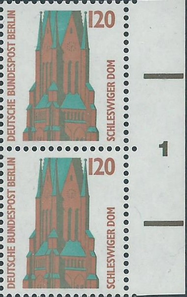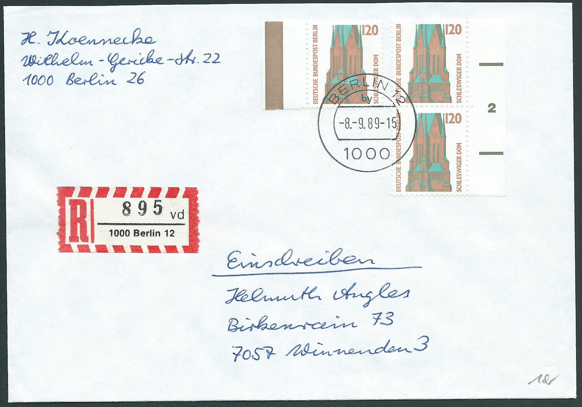 Einschreiben mit 3 Marken Mi.Nr. 815: Eine einzelmarke vom linken Bogenrand und ein senkrechtes Paar vom rechten Bogenrand mit "Formnummer" 2. Gestempelt in Berlin 12 am 8.9.89, also kann man das schon als "Datumsbrief" bezeichnen, wenn man die Zahlenfolge 8 9 8 9 betrachtet