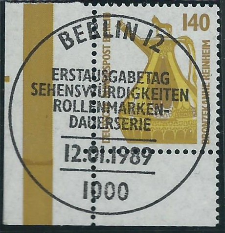 der 140 Pf-Wert als Einzelmarke vom linken Bogenrand auf Ersttagsbrief mit dem Ersttagstempel Berlin vom 12.1.89: