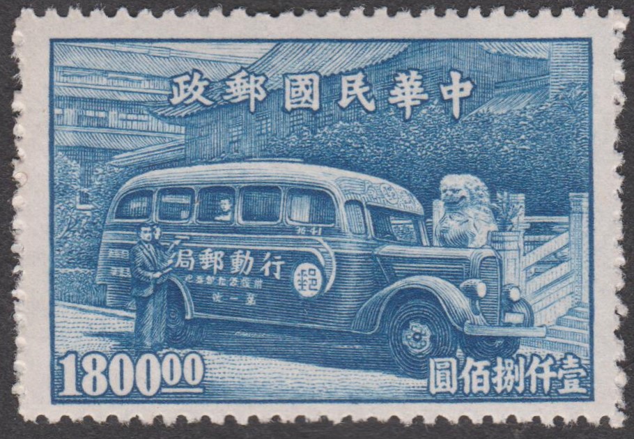 China MiNr. 829 erschien am 05.11.1947 und zeigt als Motiv ein Autopostamt: