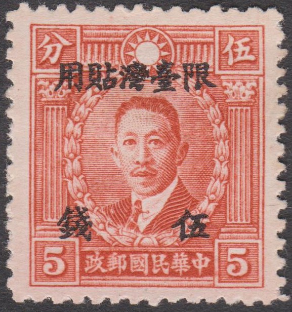 Taiwan MiNr. 15 erschien 1946, indem China MiNr. 327 mit einem Aufdruck in Schwarz versehen wurde: