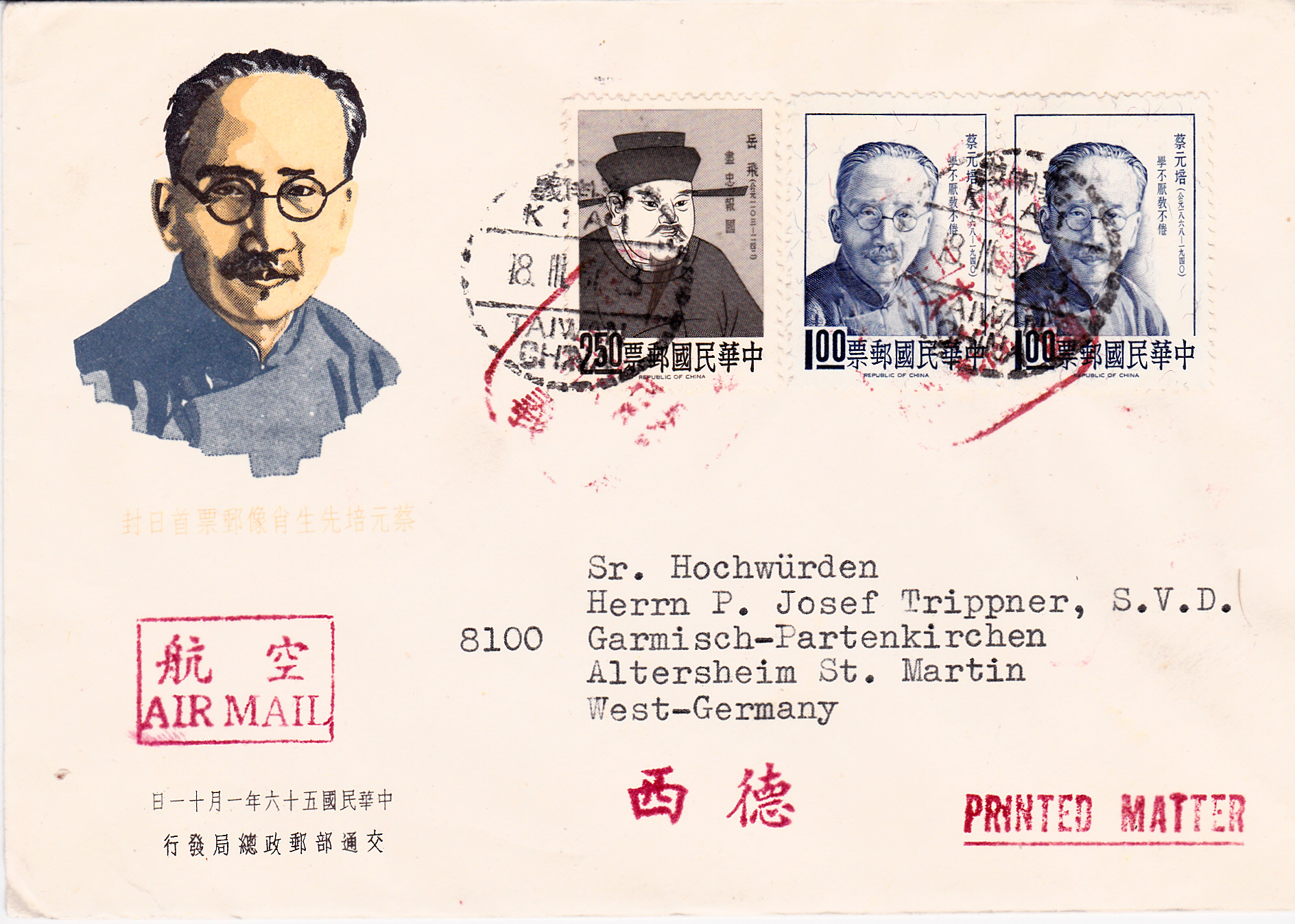 Drucksache mit Luftpost vom 18.3.1967 von Chiai nach Garmisch-Partenkirchen. Zur Frankatur wurden hier eine Marke zu 2,50$ (MiNr 606) mit einem Porträt von Yue Fei (1103-1142, General) und zwei Marken zu 1,00$ mit einem Porträt von Tsai Yuan-pei (1868-1940, Pädagoge und Politiker).