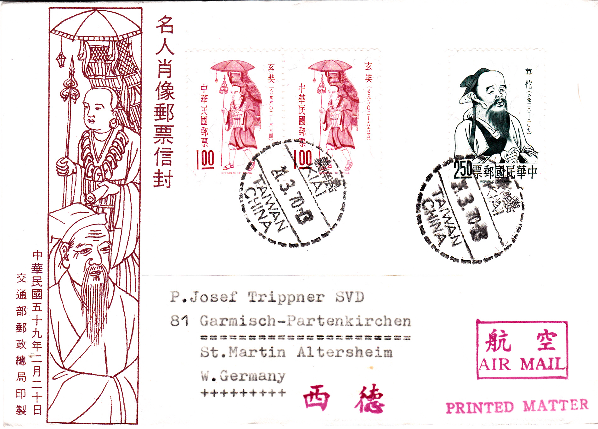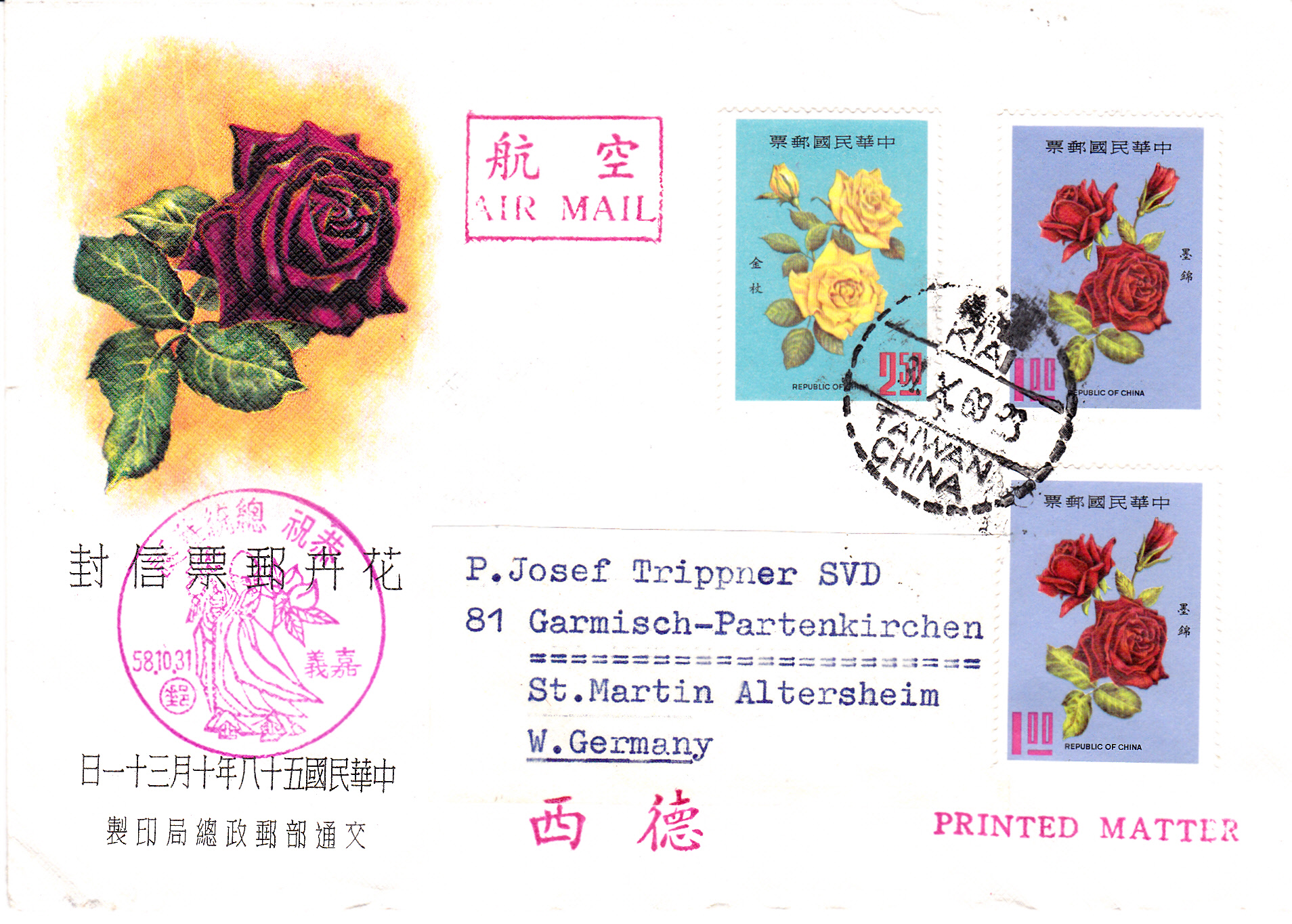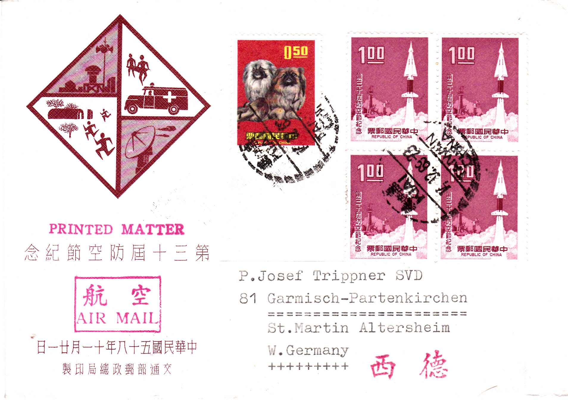 Drucksache mit Luftpost vom 18.3.1967 von Chiai nach Rom frankiert mit zwei Marken zu 1,00 $ aus der Serie "Modernisierung der Kommunikationsmittel" (MiNr 622) , einer Marke zu 2,00 $ aus der Serie "70 Jahre Staatliche Chinesische Post" (MiNr 596)und einer Marke zu 0,50 $ aus der Freimarkenserie "Chü-Kwang-Turm von Quemoy" (MiNr 519).