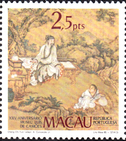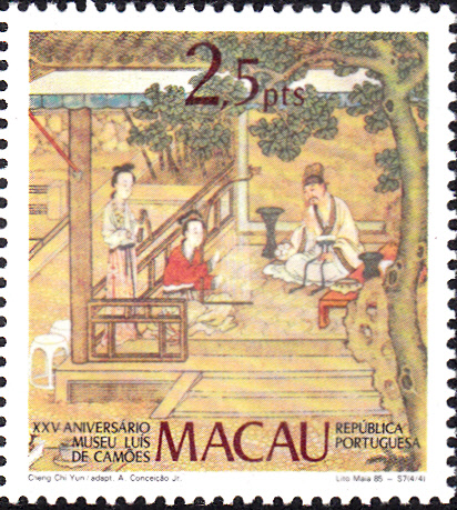 Zum Jubiläum "25 Jahre Museum Luis de Camões" ist am 27.Juni 1985 in Macau eine Serie mit Abbildungen von Seidenbilder von Cheng Chi Yun (19. Jh.) erschienen. Hier eine der Marken (MiNr 536) mit einem Einsiedler und zwei Reisenden.