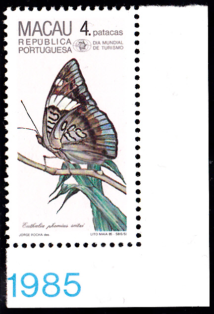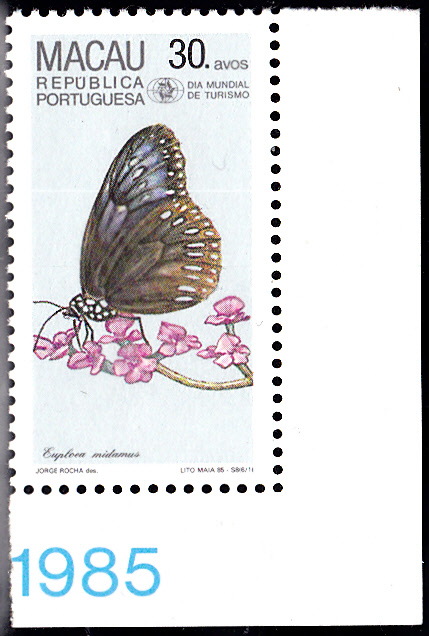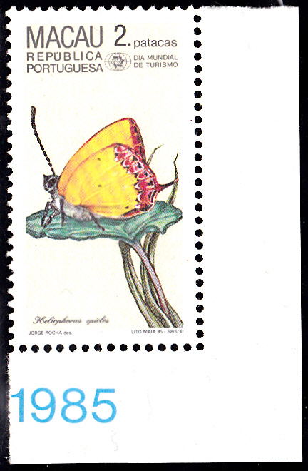 In Macau erschien 1985 zum Welttourismustag eine Serie mit Schmetterlingen. Hier die ersten beiden Marken als Eckrandstück: