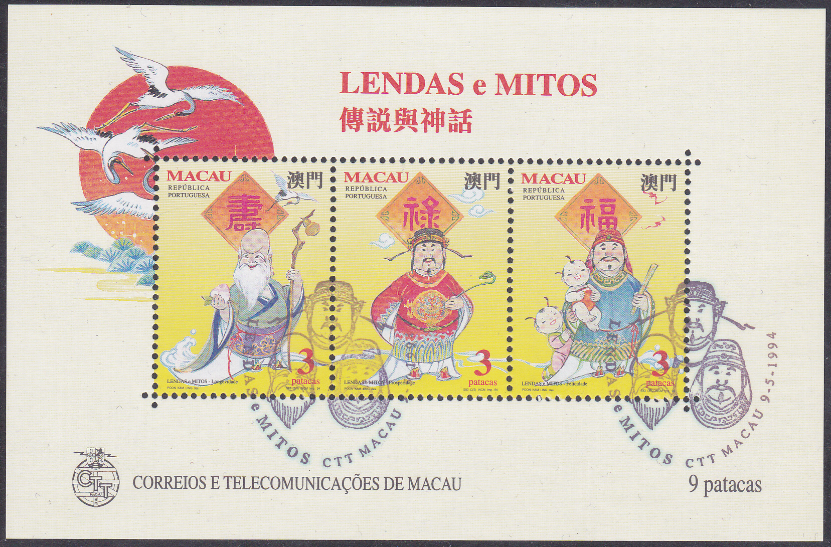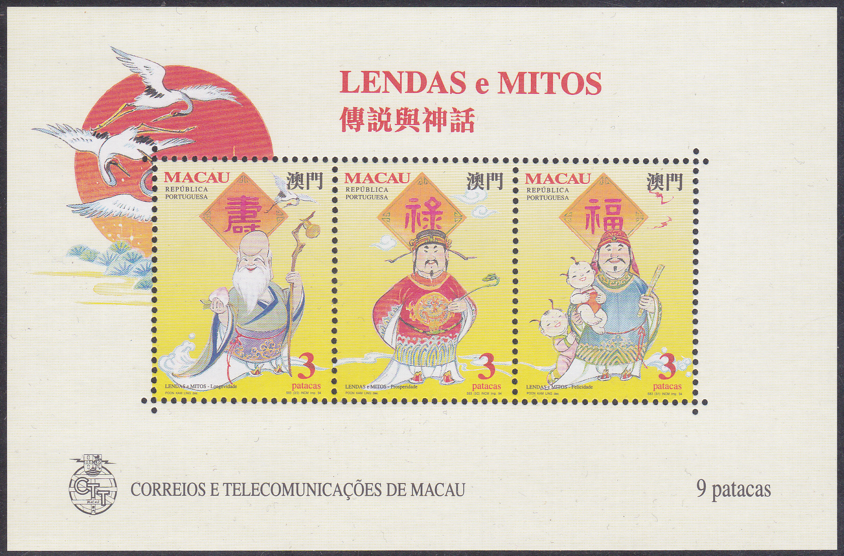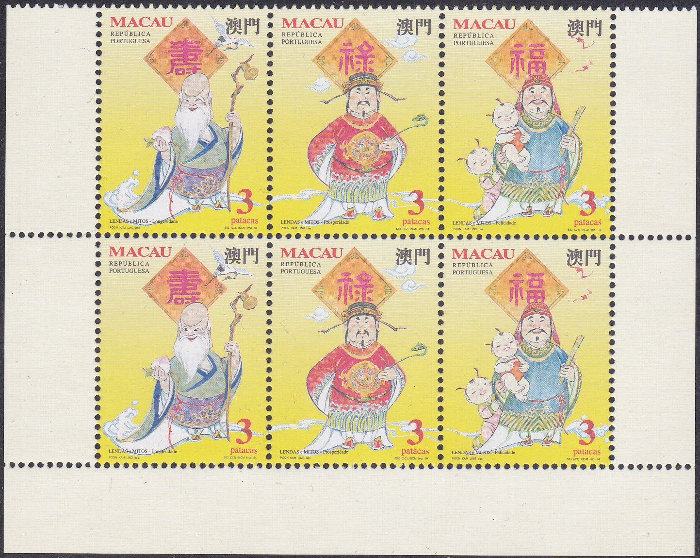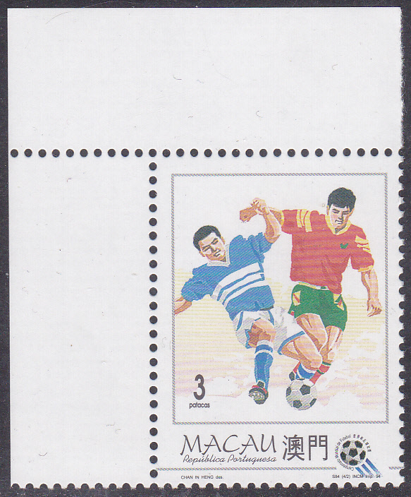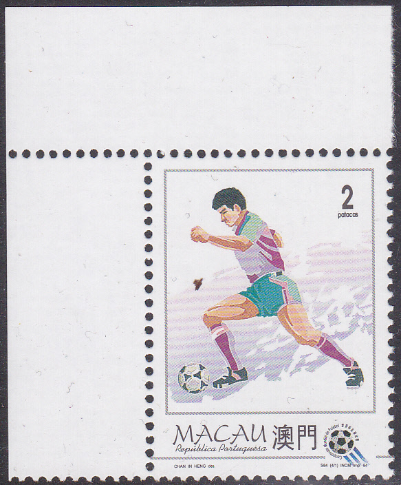 In Macau erschien auch eine Serie zur Fußball-Weltmeisterschaft 1994 in den USA. Die erste Marke (MiNr 759) zeigt einen ballführenden Spieler. Hier ein Eckrandstück dieser Marke: