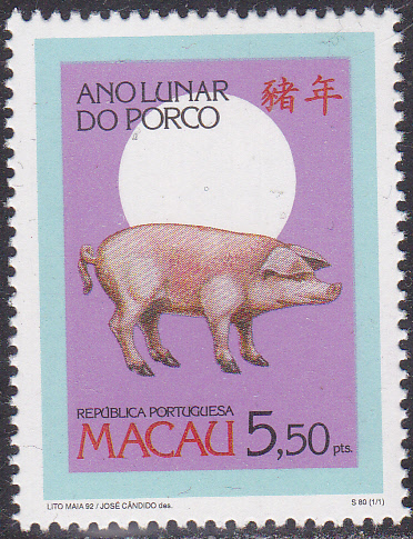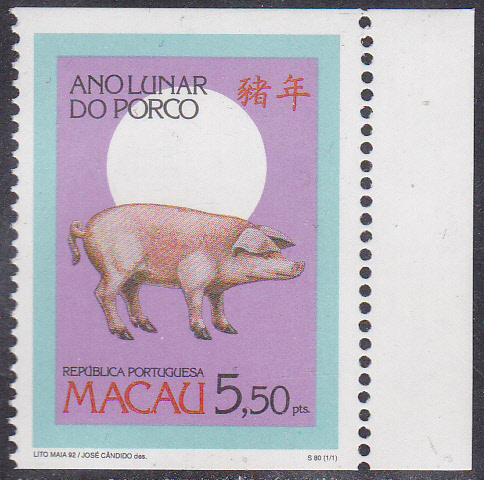 Am 23. Jan. 1995 erschien in Macau eine Marke zum Chinesischen Neujahr "Jahr des Schweines" (31. Januar 1995 bis 18. Februar 1996) mit der Abbildung eines Schweines. Hier eine vierseitig gezähnte Marke aus dem Bogen (MiNr 785 A):