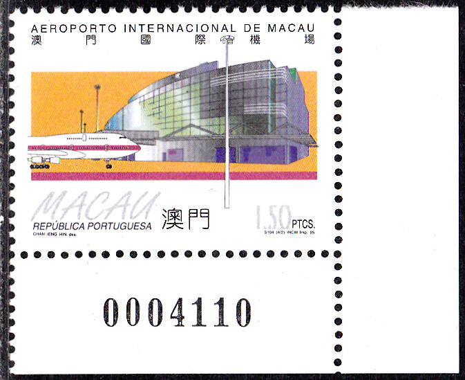 Auf der zweiten Marke der Serie wird eine Boeing 747 der Air Macau vor dem Terminal des Flughafens gezeigt. Hier wieder ein Exemplar vom Eckrand mit Bogenzählnummer.