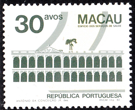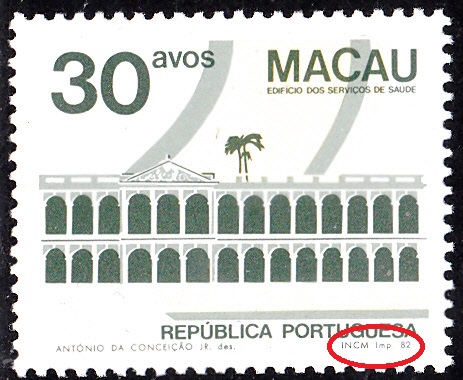 Auf dem Wert zu 20 Avos wird das Gesundheitsamt in Macau gezeigt. Hier eine Marke der ersten Auflage (MiNr 486 I) mit dem Druckvermerk "INCM Imp. 82" am rechten unteren Markenrand: