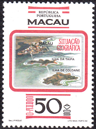 Am 1. Dezember 1982 erschien in der Ausgab "Geographische Lage von Macau" diese Marke (MiNr 495). Sie zeigt Macau mit den beiden zu Macau gehörenden Inseln Taipa und Coloane. Inzwischen verbindet eine zweite Brücke Macau mit der Insel Taipa und durch ein Landgewinnungsprojekt wachsen die Inseln immer weiter zusammen.