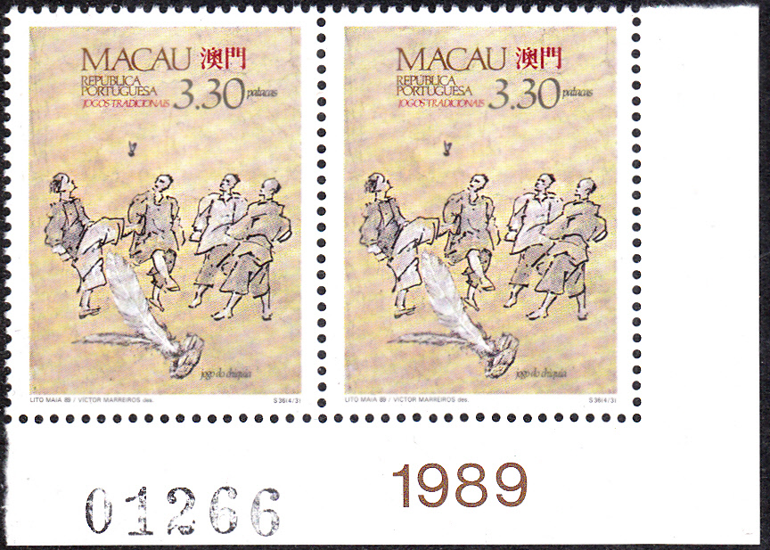 Am 31. Juli 1989 ist in Macau eine Serie mit dem Thema "Traditionelle Spiele" erschienen. Hier die erste Marke (MiNr 624)mit einer Darstellung zum "Jogo do tali" (Jogo = Spiel). Zu diesem Spiel habe ich leider keine Übersetzung des Namens finden können. Nach der Darstellung könnte es sich um eine Art "Kreisel" handeln?