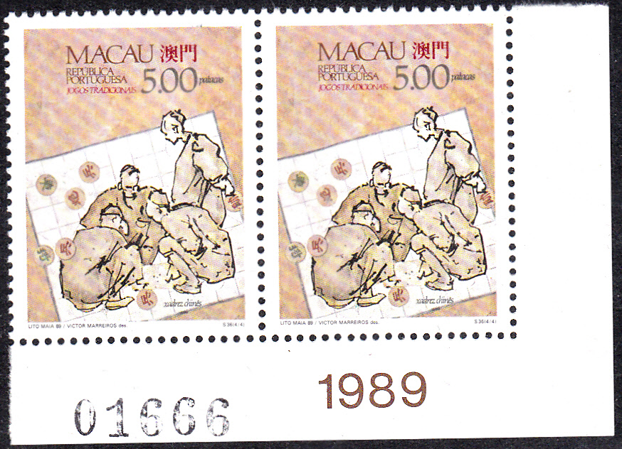 Auf der vierten Marke (MiNr 627) der Serie wird das Spiel "Xadres chinês" dargestellt. das Spiel wird Chinesisches Schach oder Xiangqi, auch Elefanten Schach genannt. Es ist ein Strategiespiel , das auf einem Brett in China und Vietnam gespielt wird. Es ist eine Simulation einer Schlacht zwischen zwei Armeen, deren Ziel es ist, den König des Gegners zu fassen.