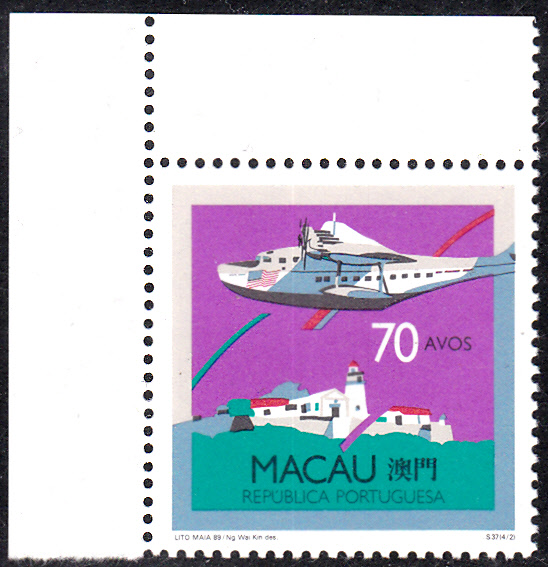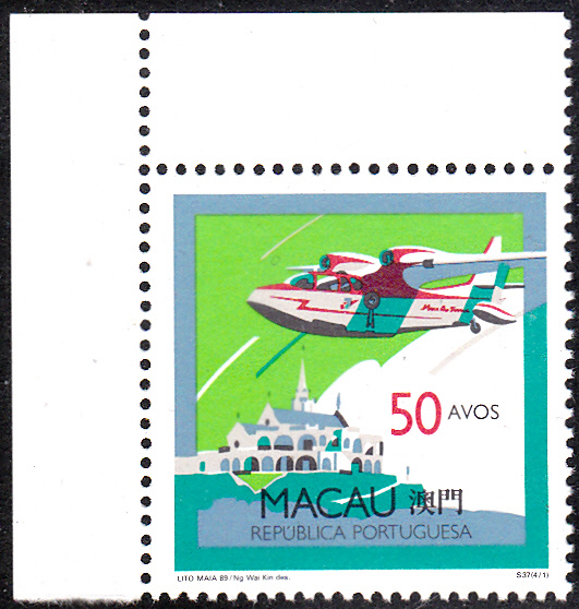 Am 9.10.1989 erschien in Macau eine Serie mit Flugzeugen. Auf der Marke zu 50 Avos (MiNr 628) wird das Amphibien-Flugzeug Piaggio P-136 gezeigt. Hier ein Eckrandstück der Marke.