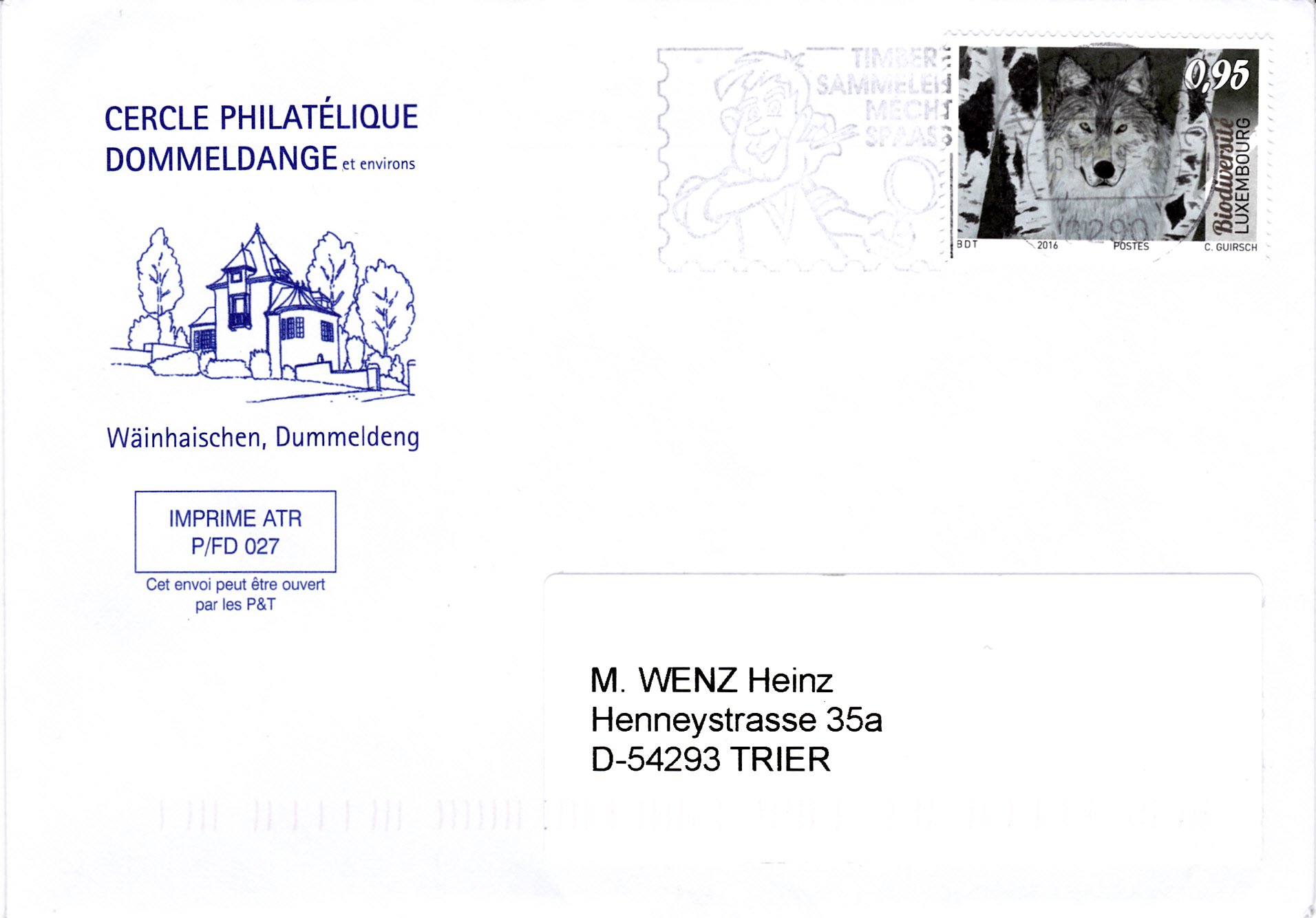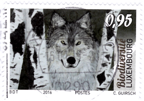 Auf dieser Marke aus Luxemburg (MiNr 2101) zum Kinder- und Jugendmalwettbewerb zum Thema "Biodiversität" wird eine Zeichnung "Wolf zwischen Birken" von Christine Guirsch gezeigt.