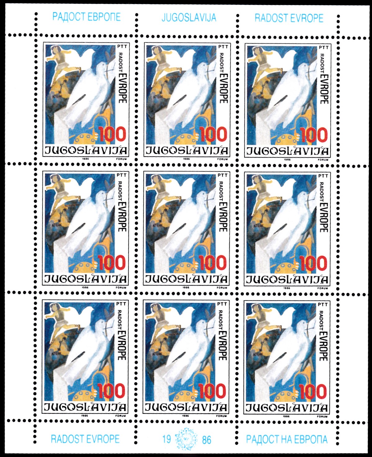 Auf der Marke aus Jugoslawien (MiNr 2194) zum Europäischen Kindertreffen "Freude Europas" im Jahre 1986 zeigt die Kinderzeichnung "Friedenstaube, Kind auf Weltkugel" von Tanja Faletic (14 J.).