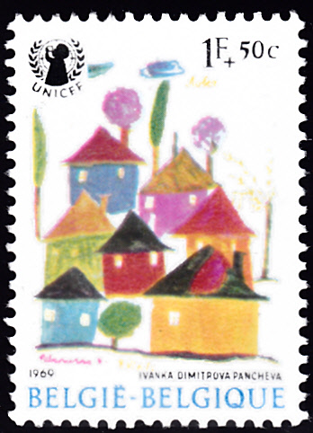 1969 sind in Belgien in einer Serie Kinderhilfswerk der Vereinten Nationen UNICEF marken mitm Kinderzeichnungen erschienen. Hier eine Marke (MiNr 1551) mit der Zeichnung "Häuser" von Ivanka Dimitrova Pancheva (Bulgarien).