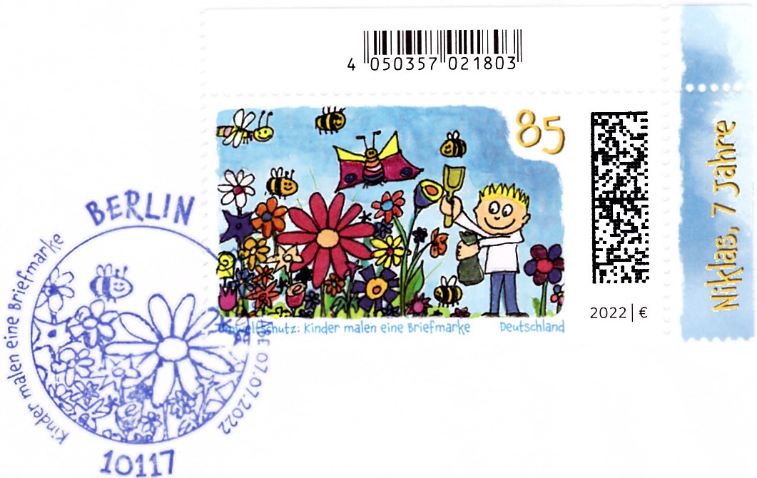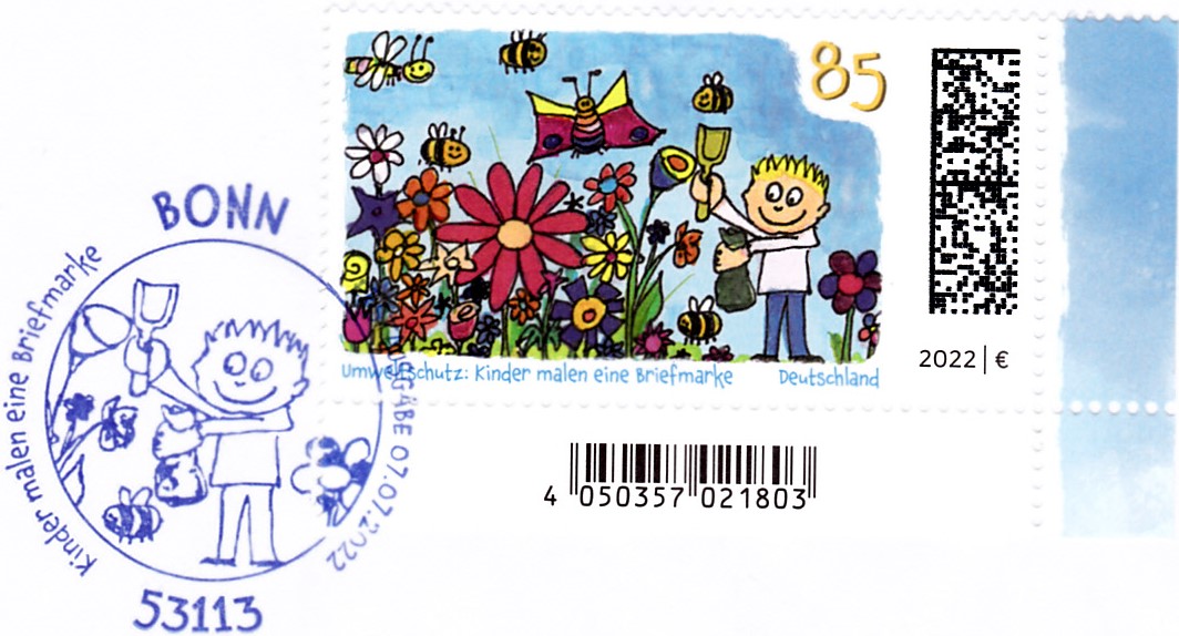 Die Marke (MiNr 3701) zeigt die Zeichnung "Junge sät Blumen für Insekten" nach dem Siegerentwurf des Malwettbewerbs von einem 7-jährigen Niklas aus Bayern. Ob dieser Entwurf tatsächlich von einem 7-jährigen stammt? Gie gezeigte Marke kommt vom Eckrand mit EAN-Codierung.