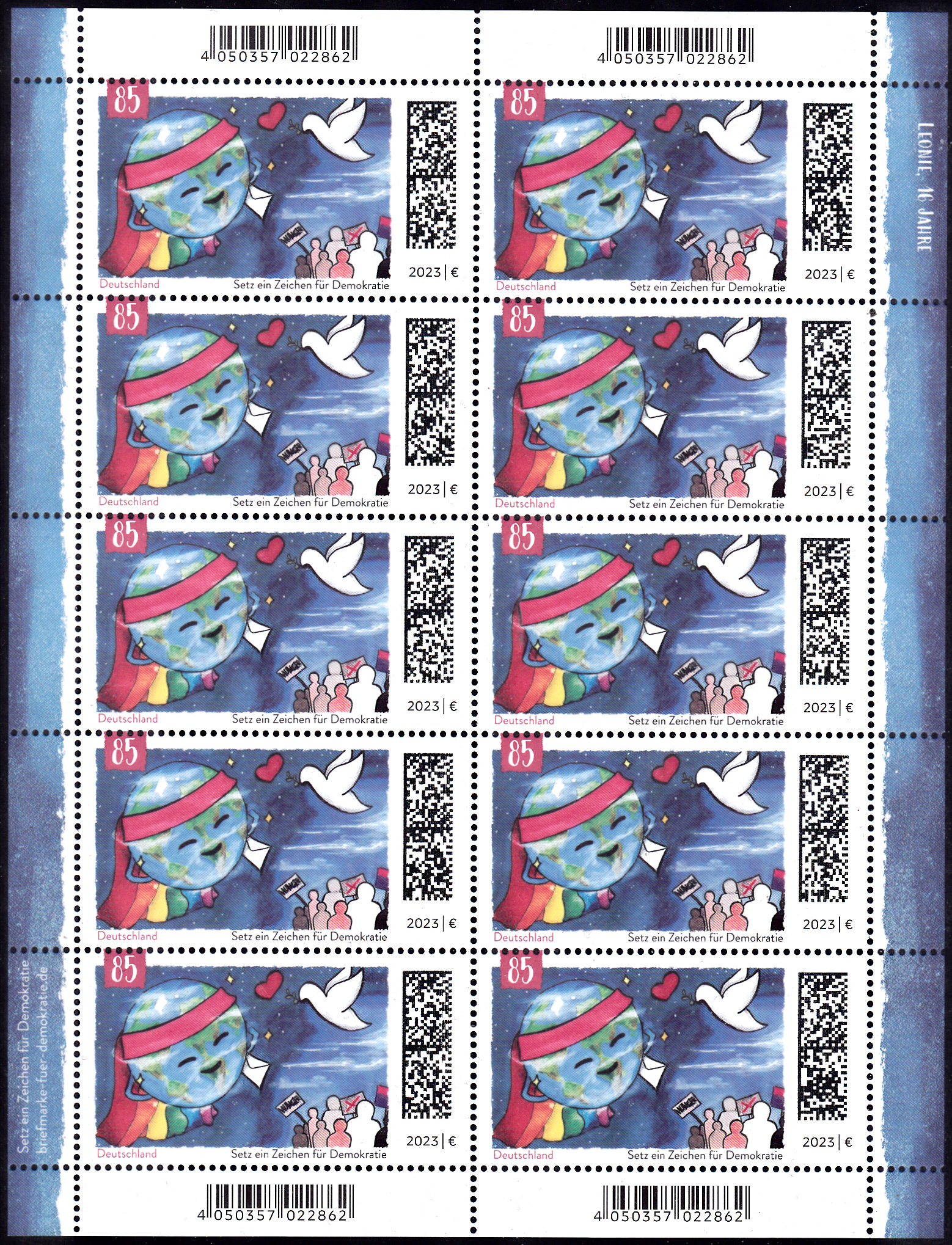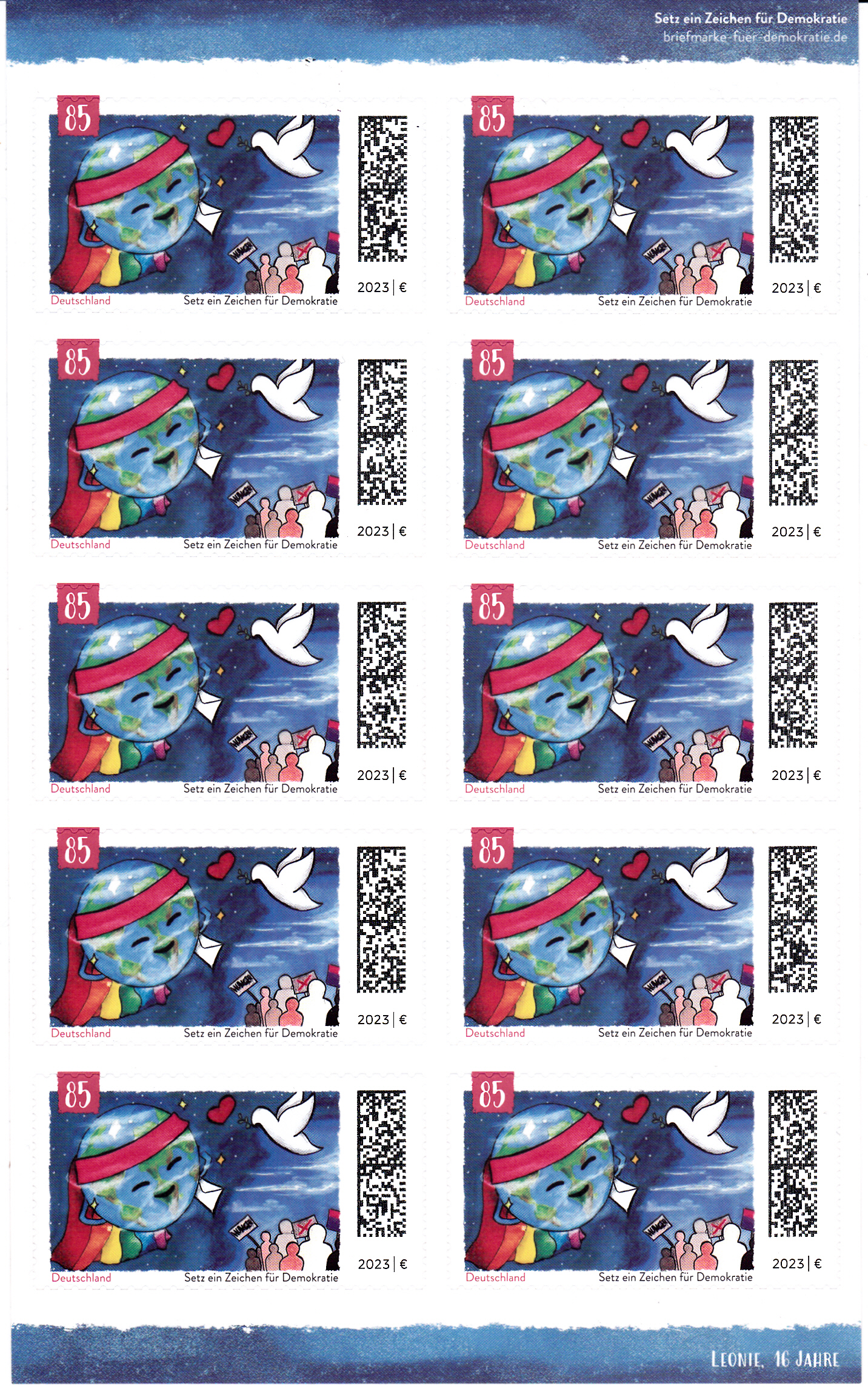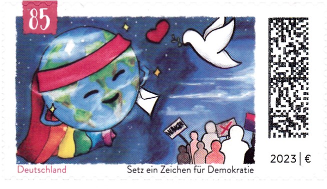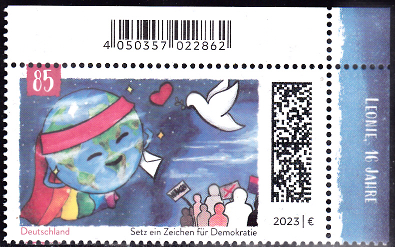 Die Marke "Demokratie" der Deutschen Post (MiNr 3769) zeigt Siegerentwurf von Leonie Hansen (16 Jahre) aus einem Postwertzeichen-Malwettbewerb zu dieser Marke,