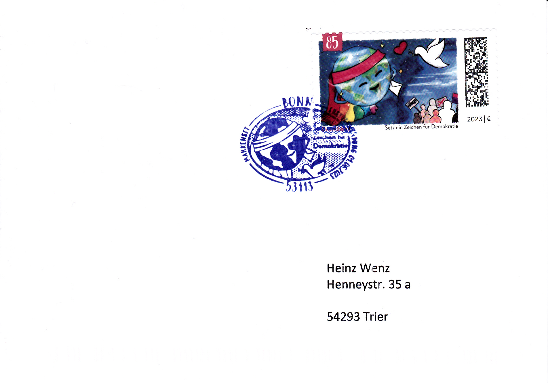 Klappkarte des Vorstandsvorsitzenden der Deutschen Post AG mit einer Marke (MiNr 3769) zum Thema "Demokratie" mit der Abbildung "Lächelnde Weltkugel mit Regenbogen-Stirnband, Friedenstaube und demonstrierenden Menschen" nach dem Siegerentwurf des Postwertzeichen-Malwettbewerbs "Setz ein Zeichen für Demokratie" von Leonie Hansen (16 Jahre) und dem Ersttagsonderstempel Bonn.