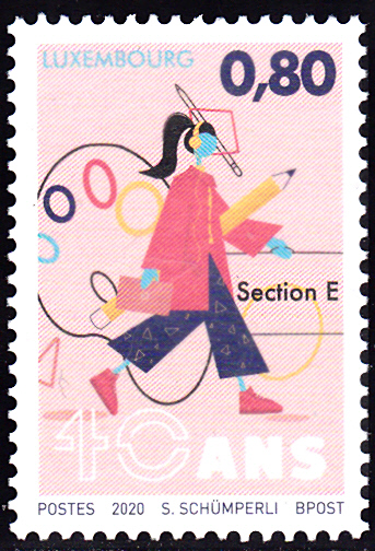 Zum Jubiläum "40 Jahre Sektion "Kunst" im Sekundarunterricht bot POST Philately Luxemburg jungen Talenten die Möglichkeit, eine Briefmarke zu gestalten. In Zusammenarbeit mit den Fachlehrern wurde ein Wettbewerb unter Sekundarschulen organisier. 24 Schülerinnen und Schüler nahmen teil. Die Jury entschied sich für den Entwurf "Kunstschülerin mit Bleistift, Zeichnungsmappe und Palette" nach einer Graphik von Sarah Schümperli als Marke zu produzieren.