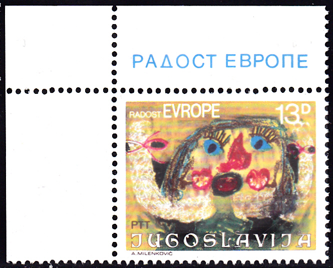 Zum Europäischen Kindertreffen "Freude Europas" erschien 1980 in Jugoslawien diese Marke (MiNr 1854) mit der Kinderzeichnung "Kinder mit Luftballons" von Gabrijela Radojević (8 J.).