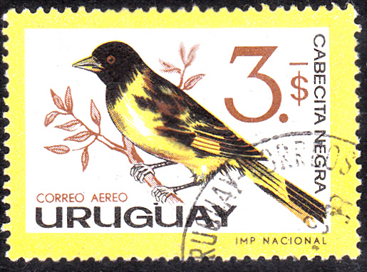 Hier zeige ich eine Marke aus Uruguay (MiNr 949) mit einem Männchen des Magellanzeisig (Spinus magellanicus). Männchen haben eine schwarzen Kopf, die Weibchen einen grünlich grauen.