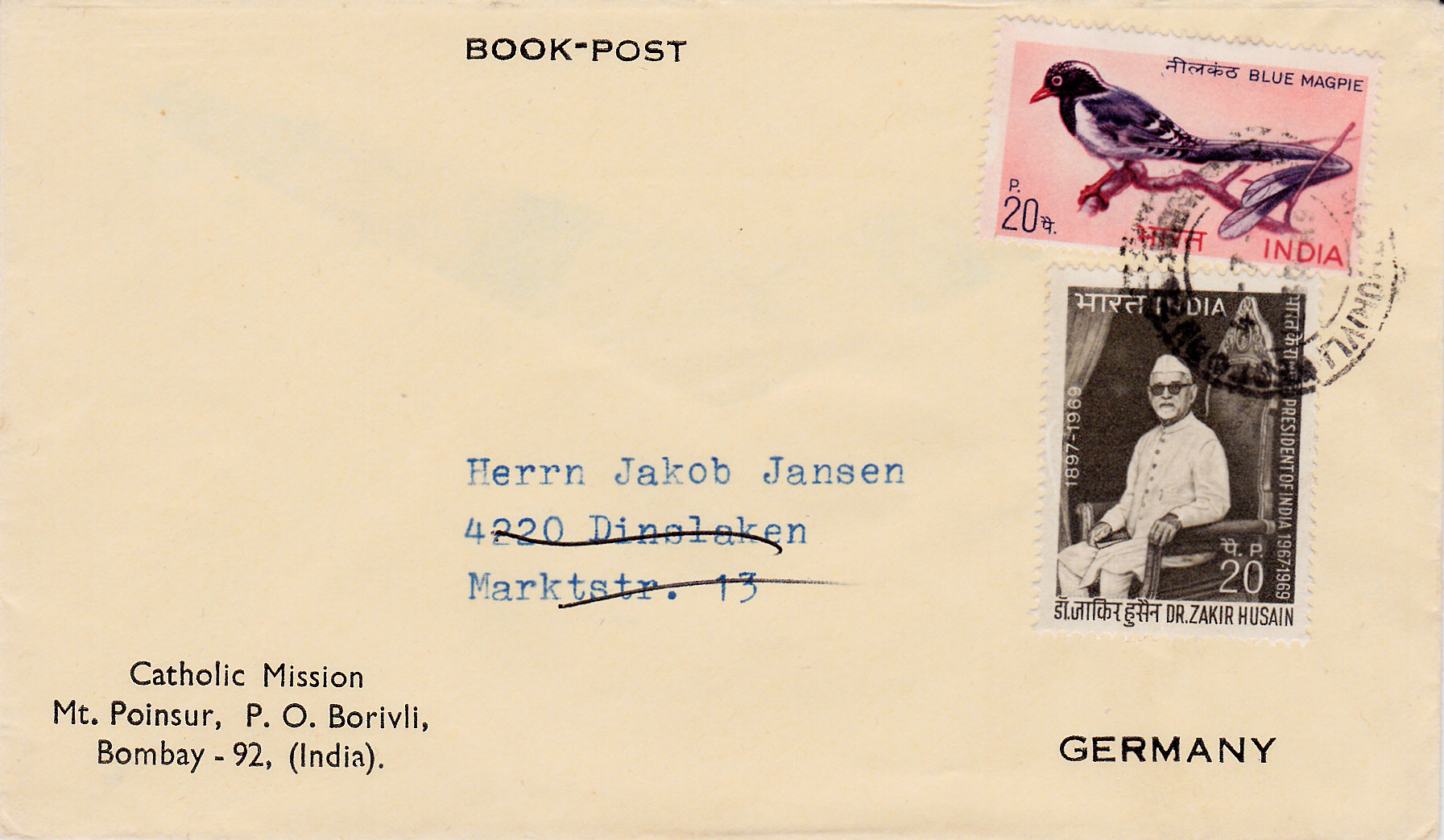 In einer Serie "einheimische Vögel" ist in Indien eine Marke (MiNr 464) erschienen, die auf diesem Umschlag zur Frankatur verwendet wurde.