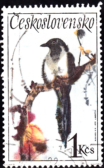 Hier eine Marke aus der Tschechoslowakei mit einer Elster (Pica pica).
