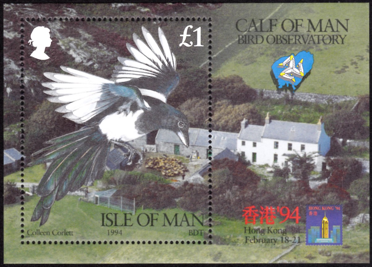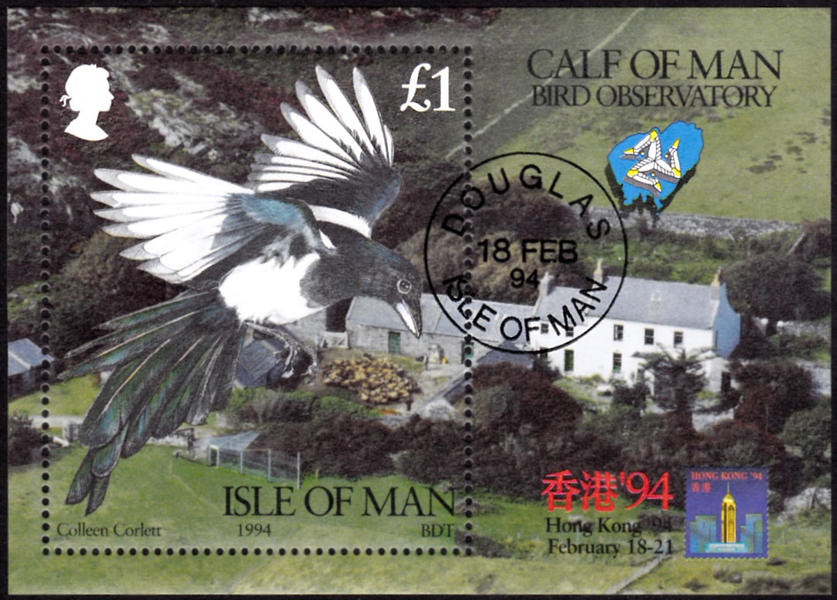 Auf der Insel Man ist auf der Marke (MiNr 576) im Block (MiNr Block 20) ein Elster im Flug abgebildet.