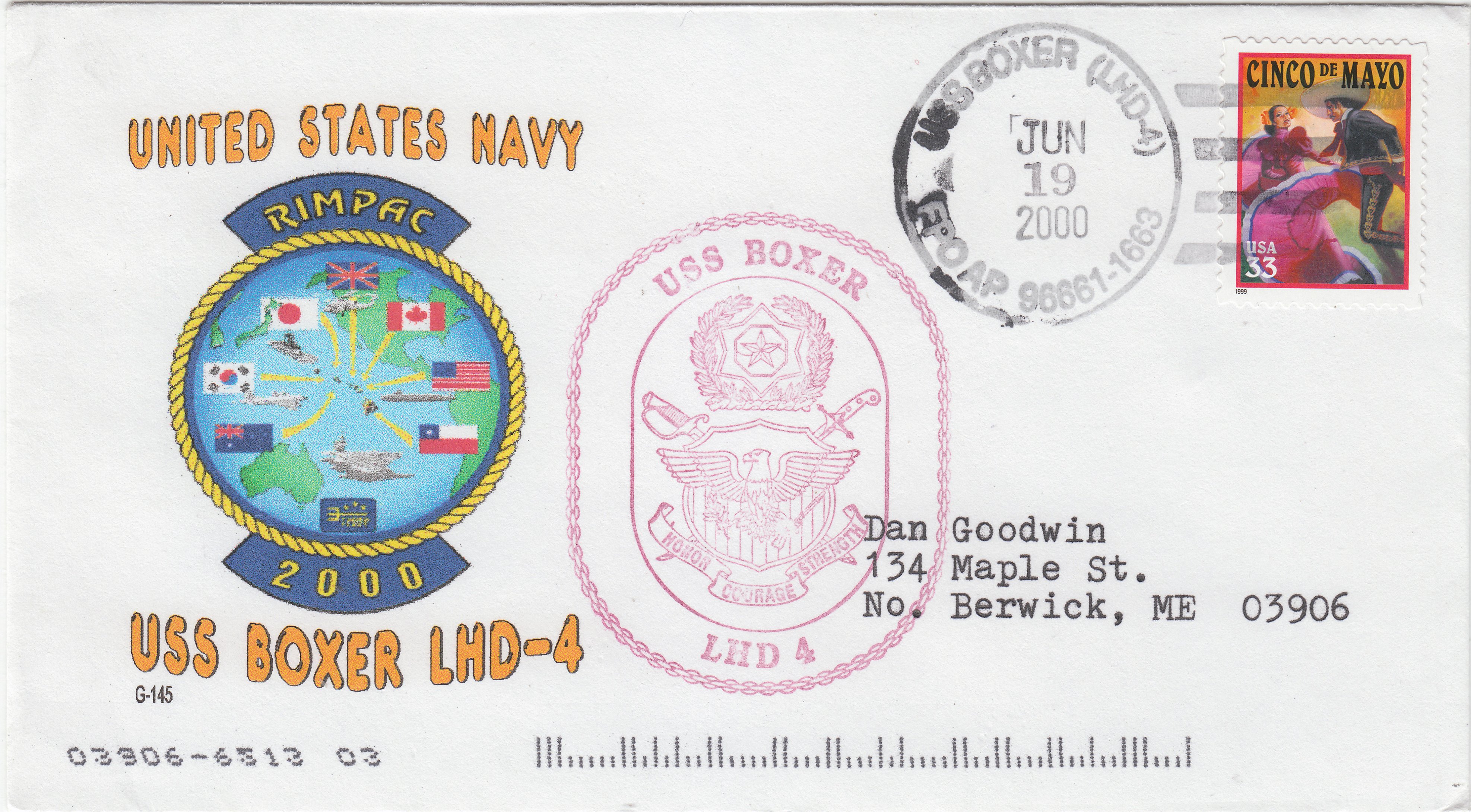 Der Beleg wurde während der Übung RIMPAC 2000 abgeschickt. Bei dieser Übung bildete die USS BOXER (LHD 4) zusammen mit der USS Harper's Ferry (LSD 49) die ''Amphibious Task Force'', die den Flugzeugträger USS ABRAHAM LINCOLN (CVN 72) mit seiner Kampfgruppe unterstützte, die hier zu sehen ist: