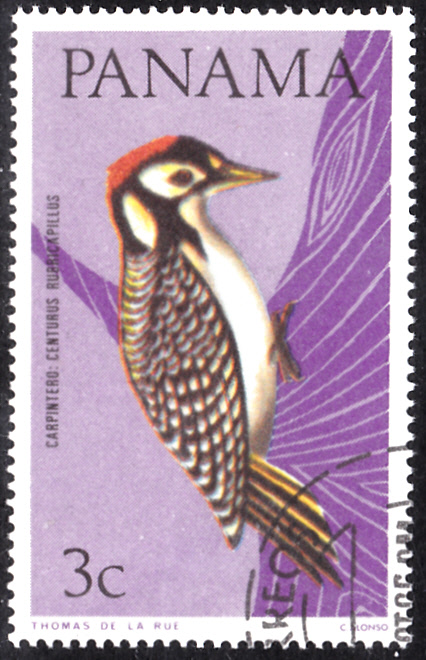 Diese Marke aus Panama (MiNr 846 A) zeigt einen Schläfenfleckspecht (Melanerpes pucherani). Michel nennt ihn Schwarzwangenbänderspecht (Melanerpes pucherani).