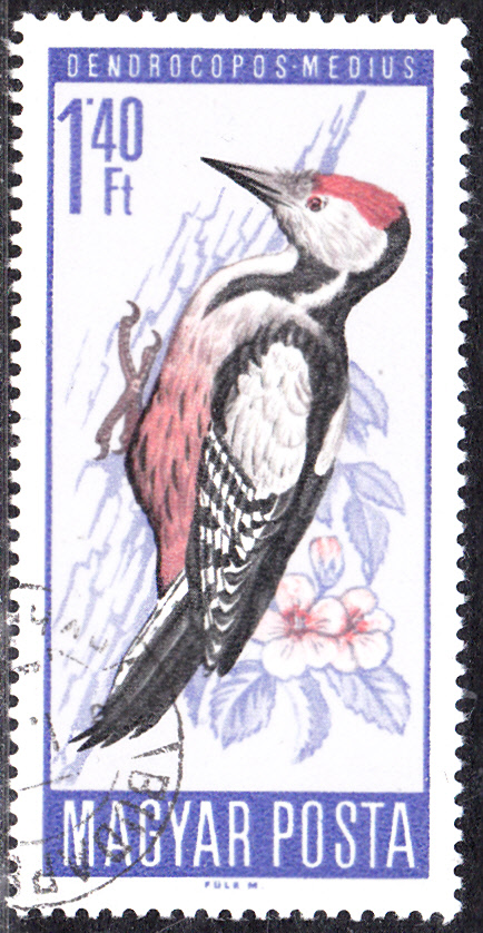 Auf dieser Marke aus Ungarn (MiNr 2234 A) sitzt ein Mittelspecht (Dendrocopos medius) an einem Baumstamm.