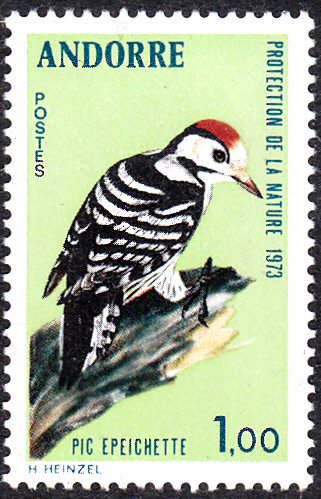 Ein weiterer Kleinspecht (Dendrocopos minor) sehen wir auf dieser Marke der französischen Post in Andorra (MiNr 254).